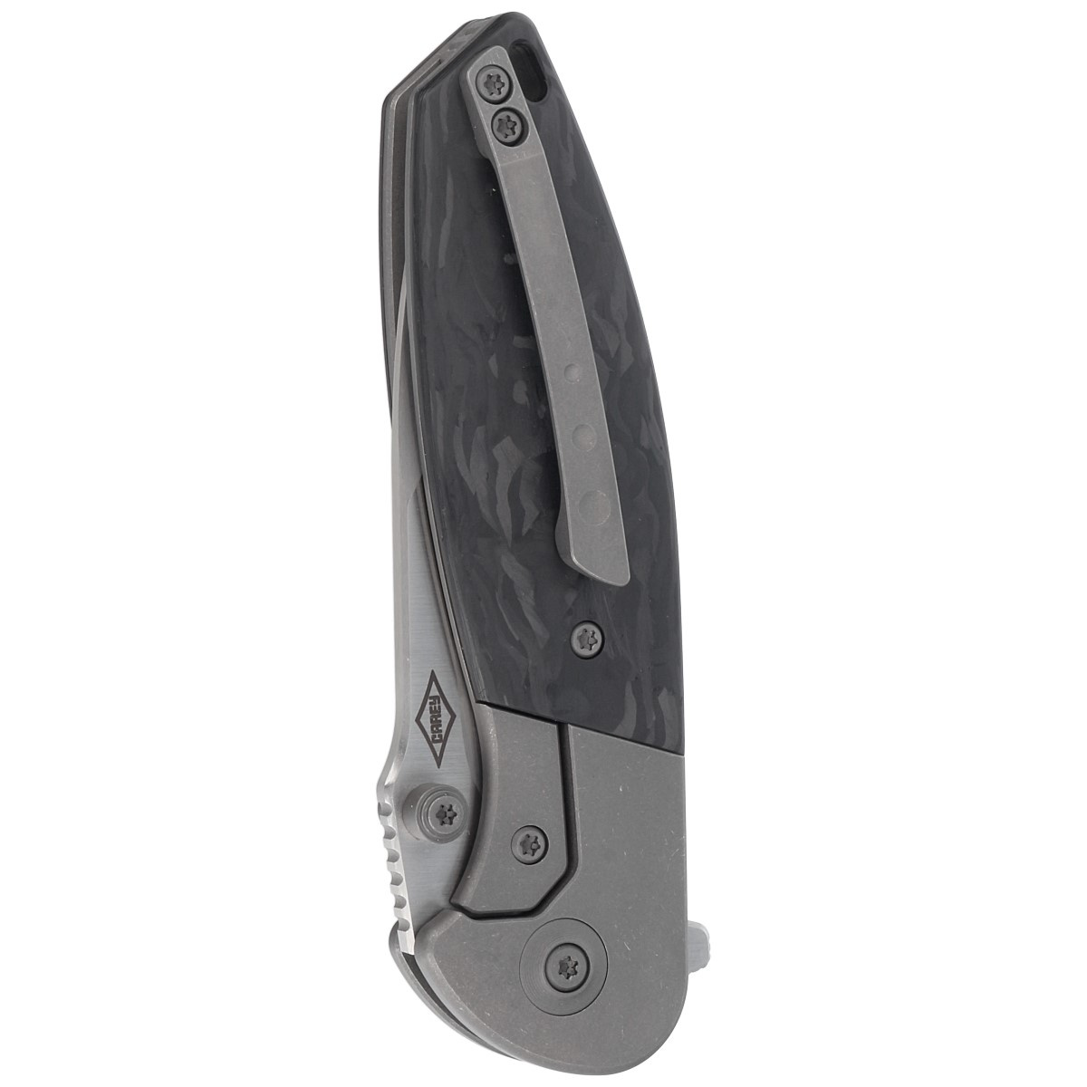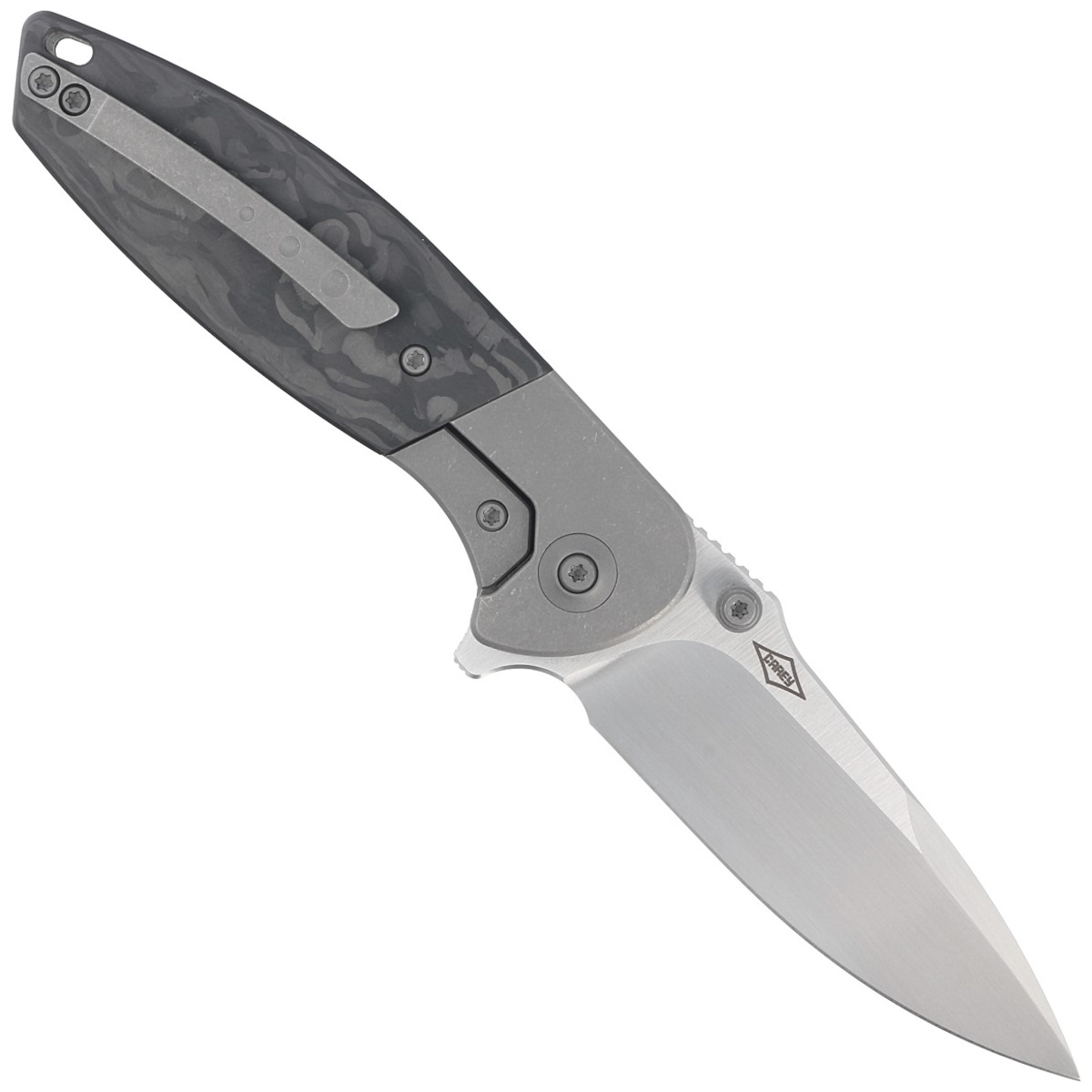 Handle material: Titanium 6AL4V / Marbled Carbon Fiber.