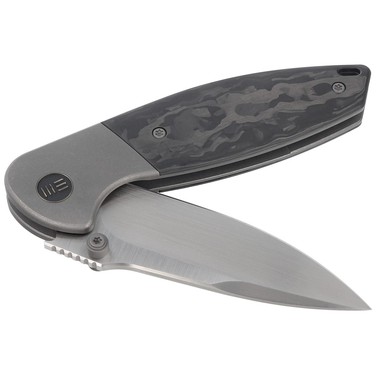 Handle - bolsters made of 6AL4V titanium, handle made of Marble Carbon Fiber, a carbon fiber with marble texture. Chamfered edges of the covers eliminate sharp edges. The facings are screwed to an intricately machined titanium backspacer, giving assurance of many years of use. The pivot is decorated with a stylized WE Knife brand logo. A single-position (right) titanium deep-carry clip allows you to carry the knife discreetly in your pocket in the tip-up (blade tip up) position.
