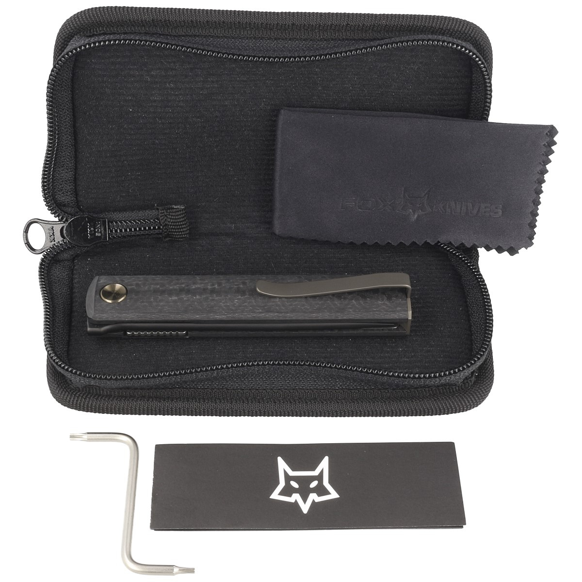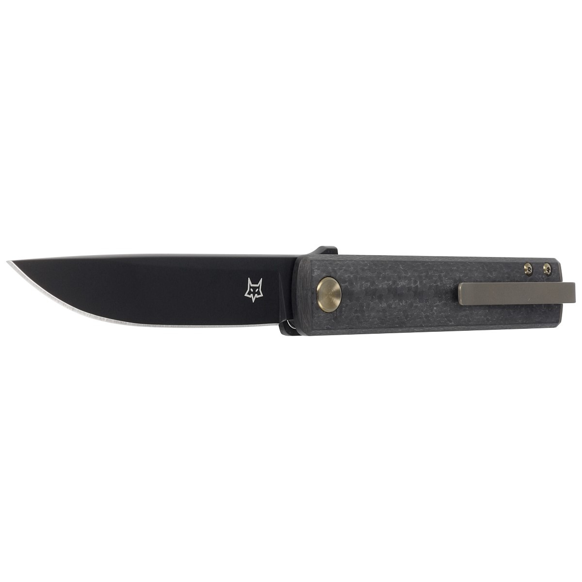 Chnops Black Carbon Fiber, Black PVD is a slim gentlemans folder knife. Beautiful carbon fiber facings, titanium clip, backspacer and screws, blade made of excellent M390 steel additionally coated with black PVD. An excellent choice for EDC! Designed for Fox Cutlery by Riccardo Gobbato, Italian designer and knifemaker.