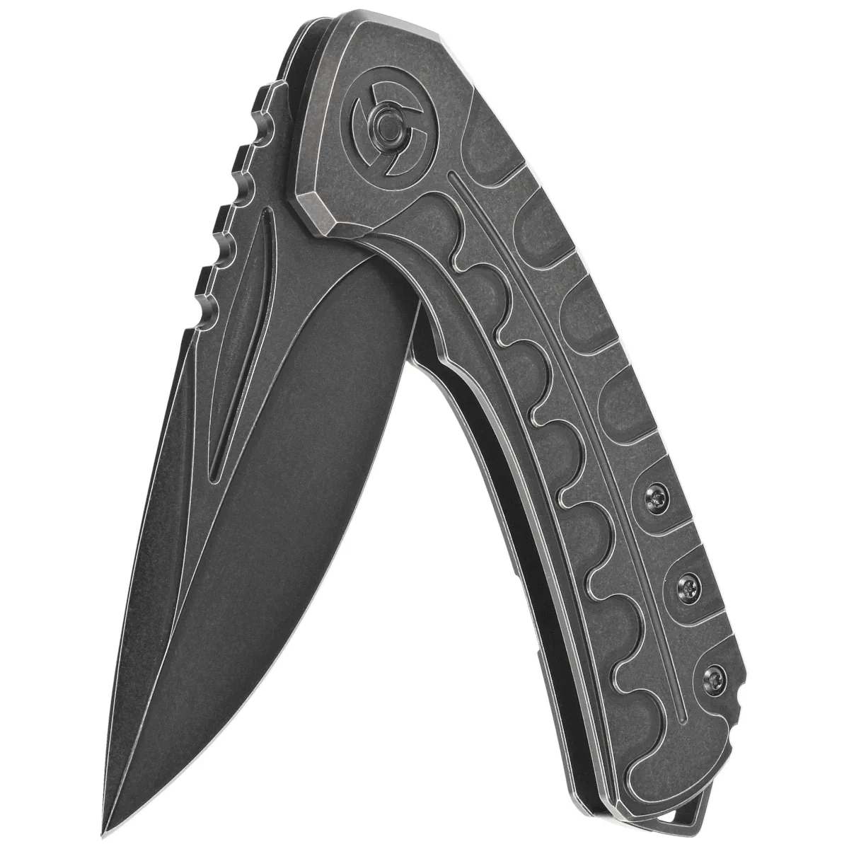 Buwaya Black Titanium, Black Stonewashed is a factory reissue of the custom folder of the same name, designed by Polish designer Grzegorz "Kombou" Grabarski and made by Rafal "Brrr..." Brzeski. Intricately decorated titanium handle, excellent blade steel, high quality workmanship by Bestech!!!