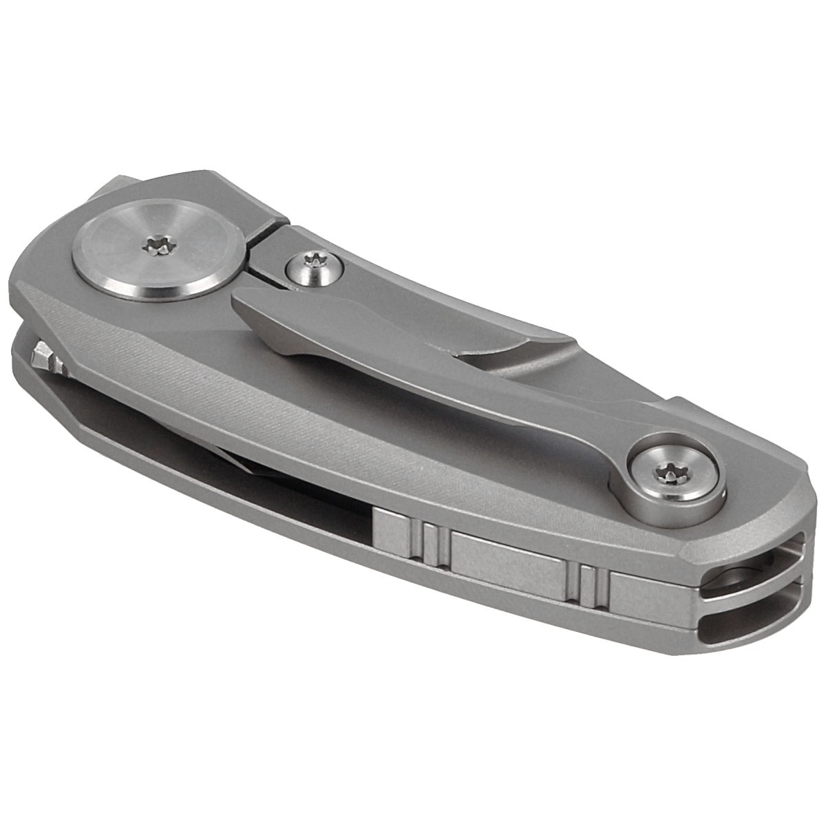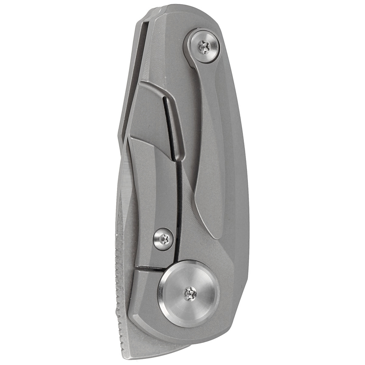Handle - made of titanium 6AL4V, screwed to the backspacer, also made of titanium. Contouring of the cover eliminates sharp edges for a comfortable and secure grip. The simple, secure design gives assurance of years of use. A flat, low-profile, single-position (right) titanium clip allows the knife to be carried discreetly in the tip-up (tip up) position.
