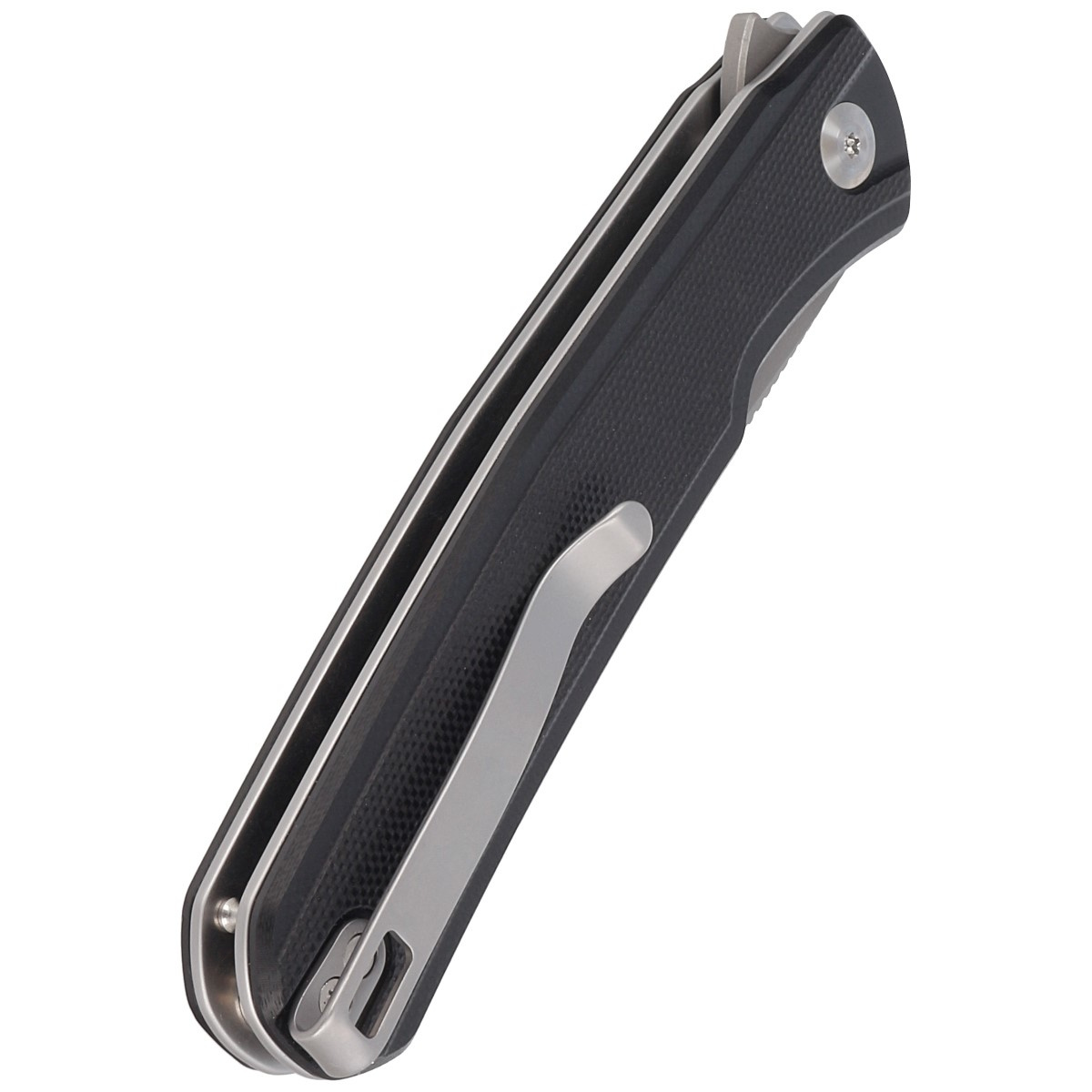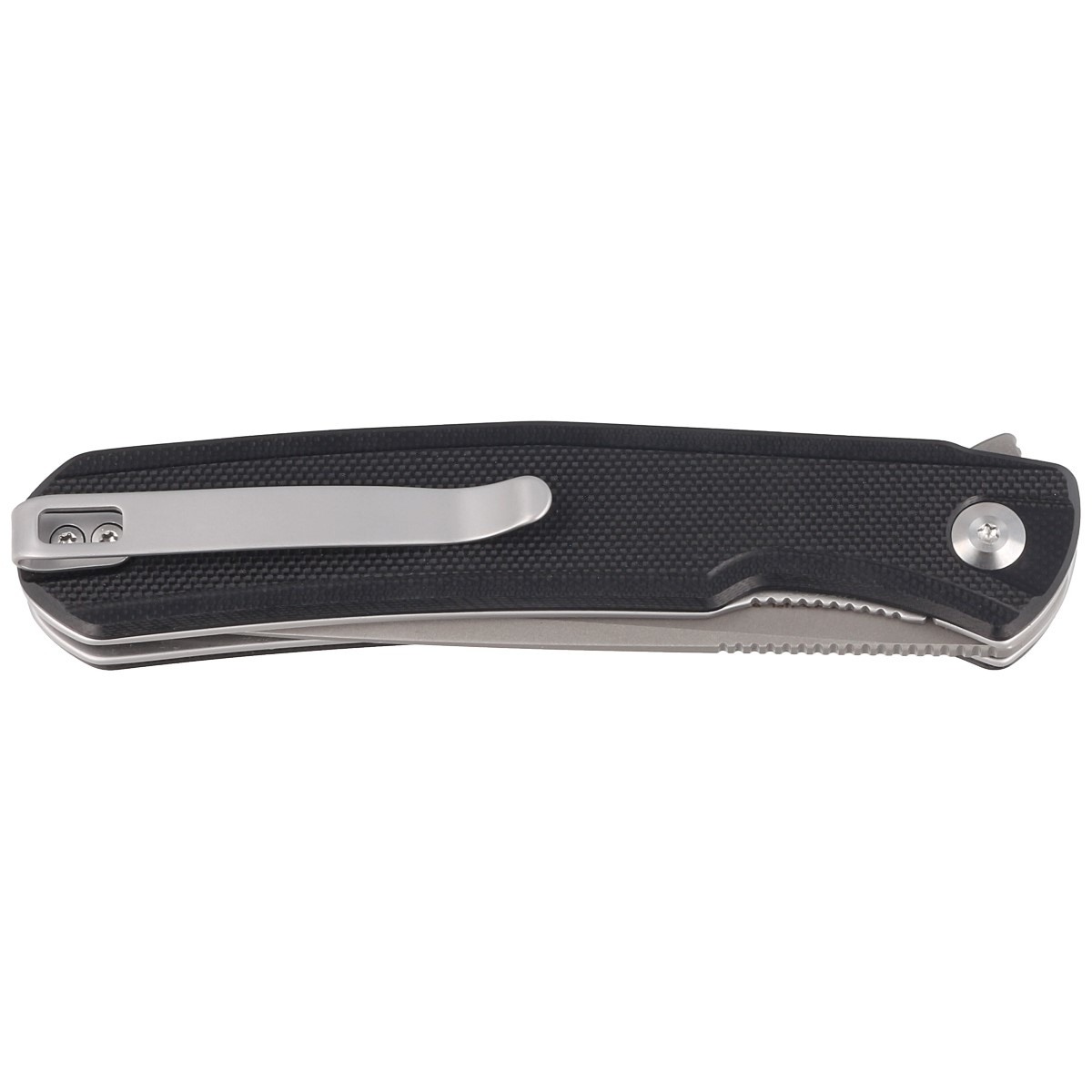 Handle - made of G10, a composite fiberglass material compressed under pressure with synthetic resin. The aggressive texture of the lining provides a secure grip, even with wet hands. The cover's chamfered edges eliminate sharp edges for comfort, and the jimping made in the front on the liners improves ergonomics. An open-backed design fixed with steel spacer sleeves reduces weight and makes cleaning easier. A two-position right/left deep carry clip allows you to carry the knife discreetly in your pocket in tip-up position (blade tip up).