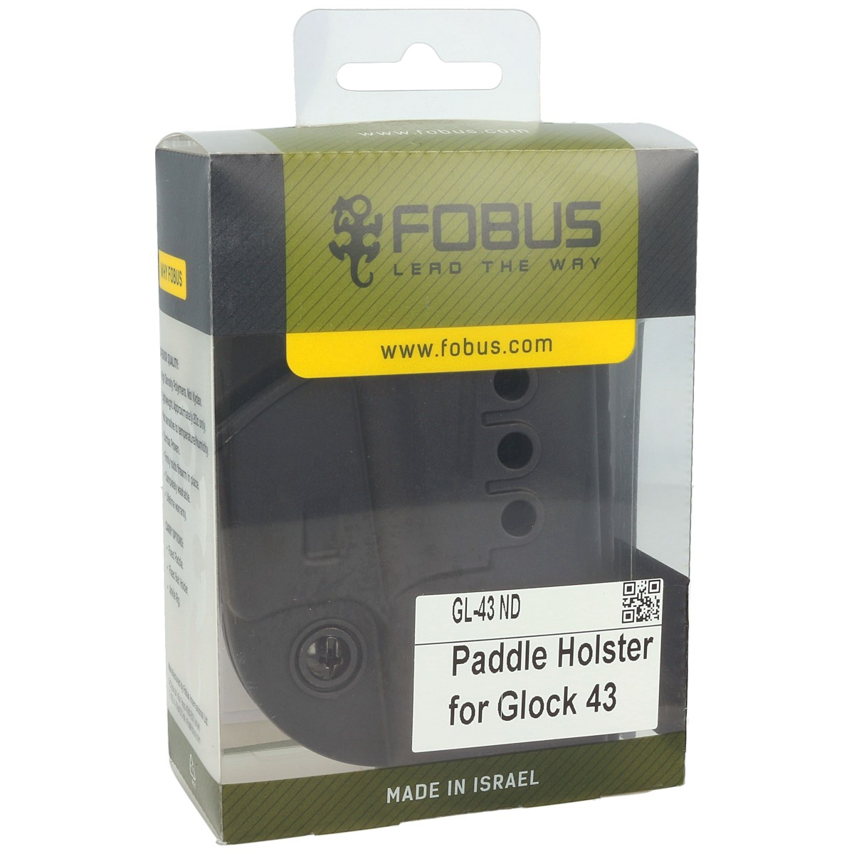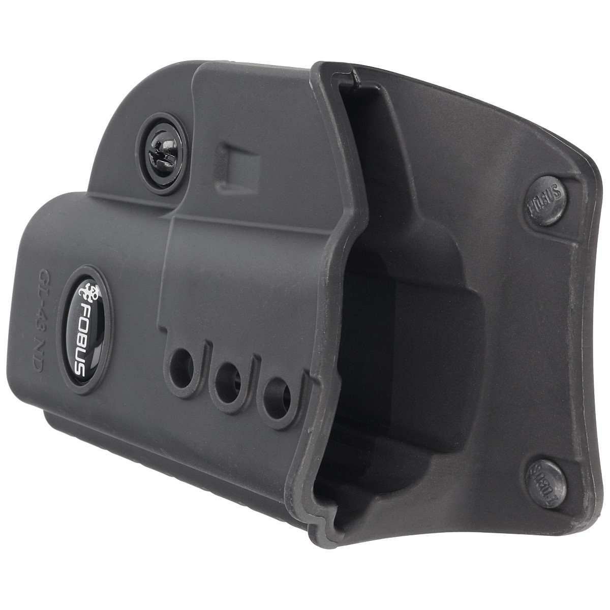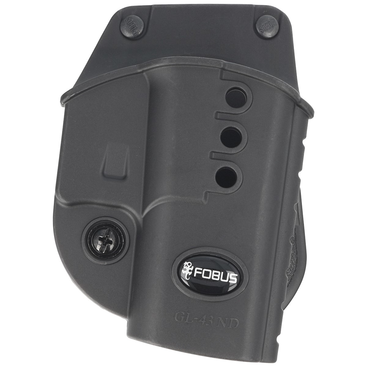Type of holster ND (New Design) - new generation of holsters Fobus. Made of one piece of plastic, it is lightweight despite the extra features. Includes a strip of metal to reinforce the rivets attaching the holster to the fin for improved strength and reliability. Weight reduction was achieved by using holes on the surface of the holster. ND series has an additional screw at the bail for individual adjustment of the clamping force. The adjustment affects the force with which the weapon is held in the holster and the force with which it is drawn. Low profile makes it easier to conceal the weapon, increasing the comfort of carrying it. The holster protects the weapon well from damage, does not tend to move.
