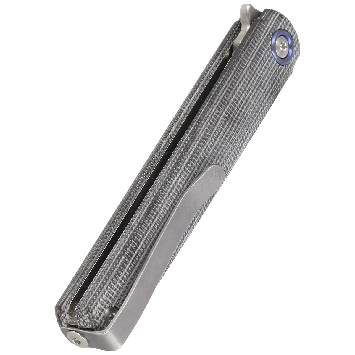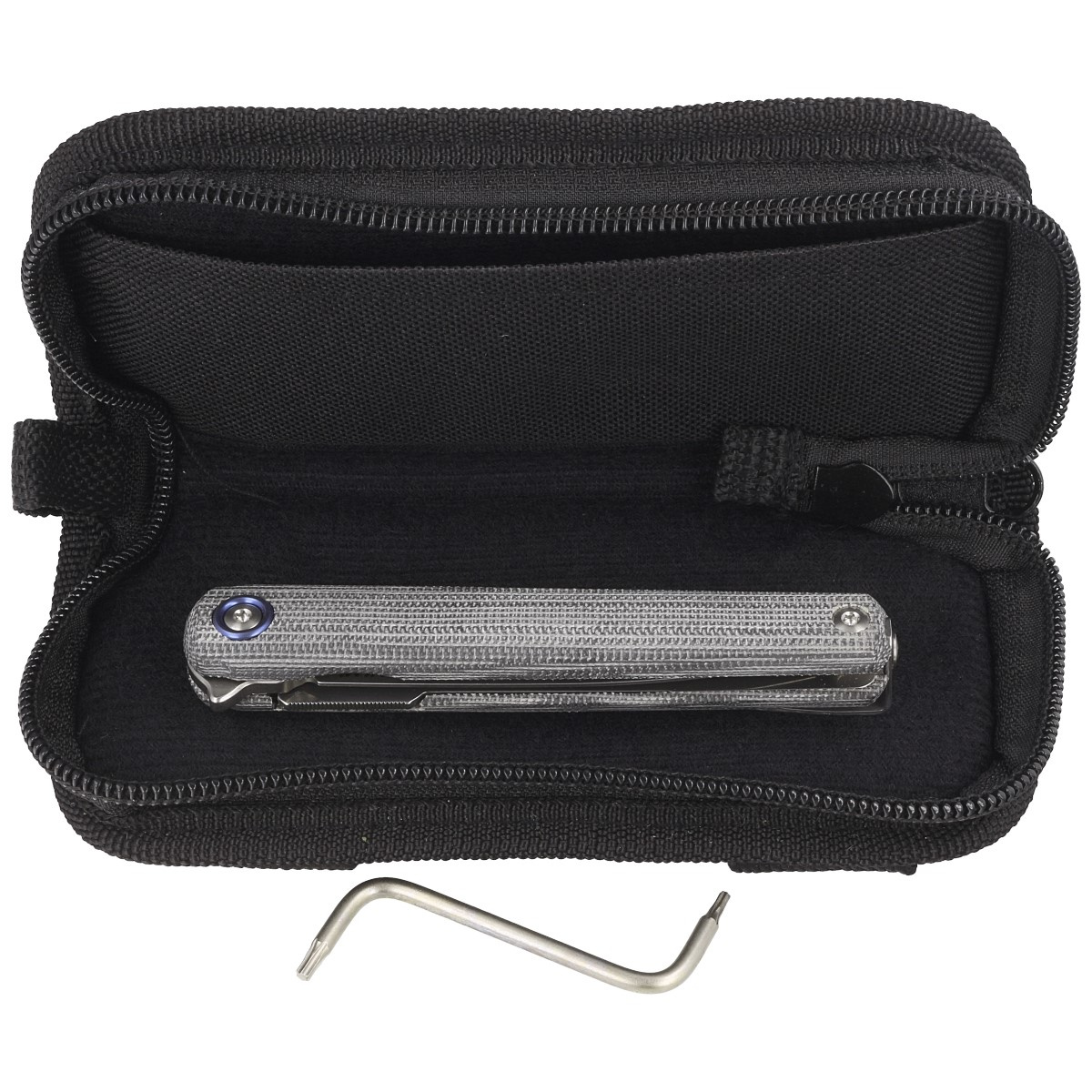 Handle - made of Canvas Micarta, a material that combines low weight with high wear and weather resistance. The slightly textured surface increases grip, even in humid environments. Construction based on steel liners bolted together using a spacer sleeve provides rigidity with minimal weight. A double-sided deep carry clip allows the folder to be carried discreetly in a pocket by both right- and left-handed users. A subtle anodized ring detail around the pivot adds a distinctive touch to the design. The folder comes in a soft Cordura case with zipper and belt-tie option - ideal for safe carrying or storage. T6/T8 torx keys are also included.