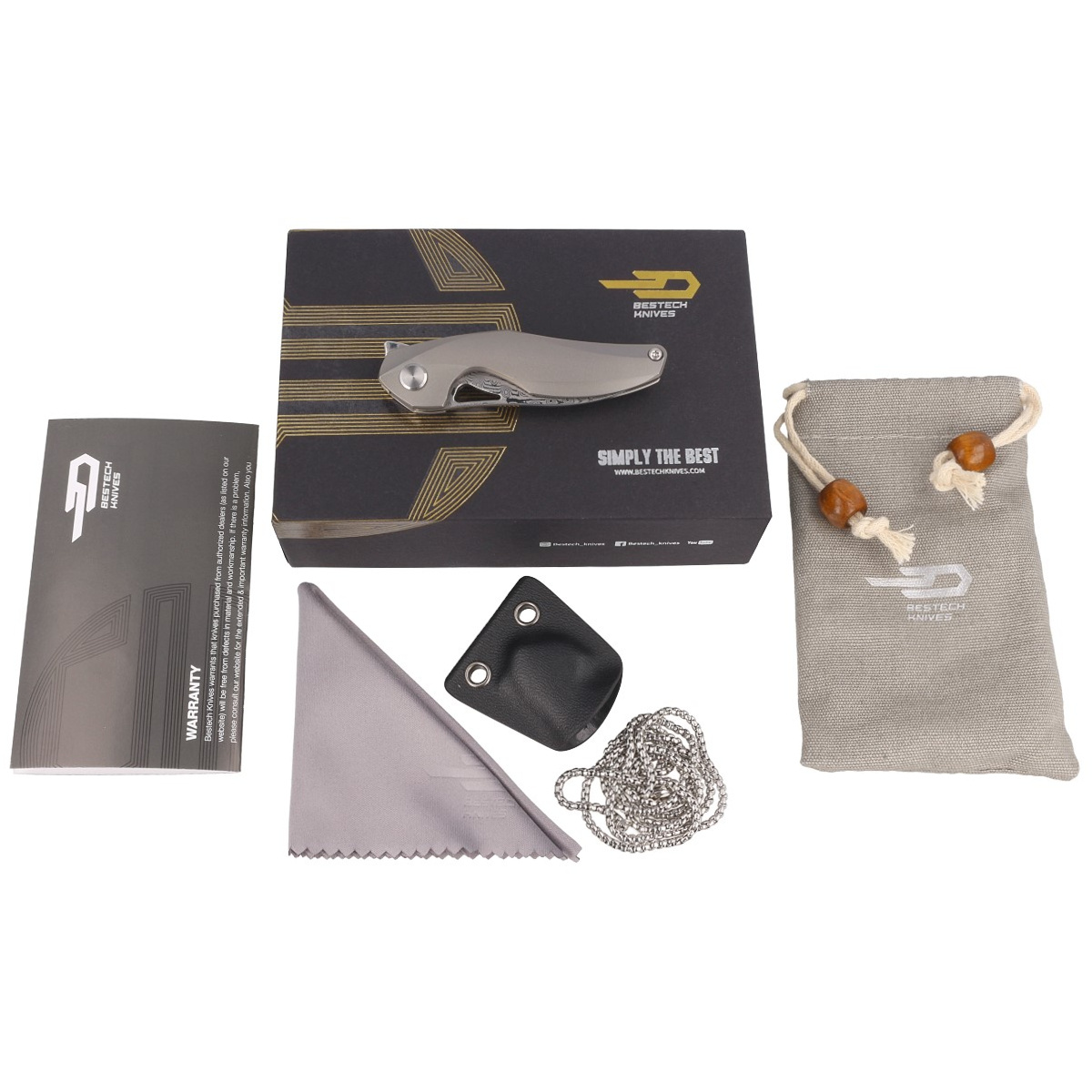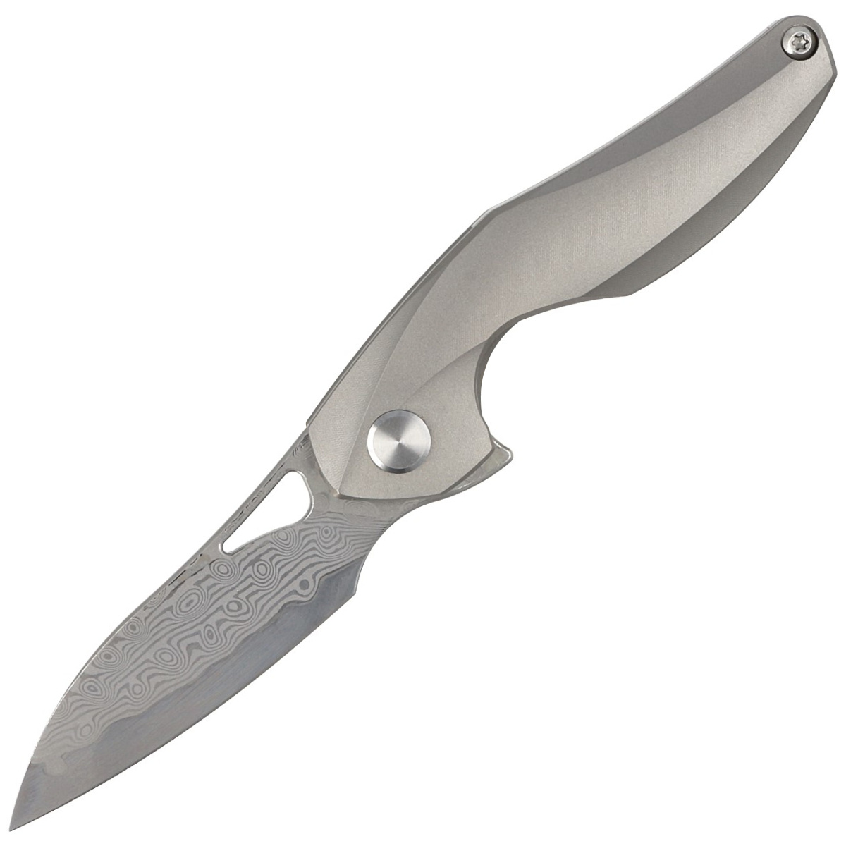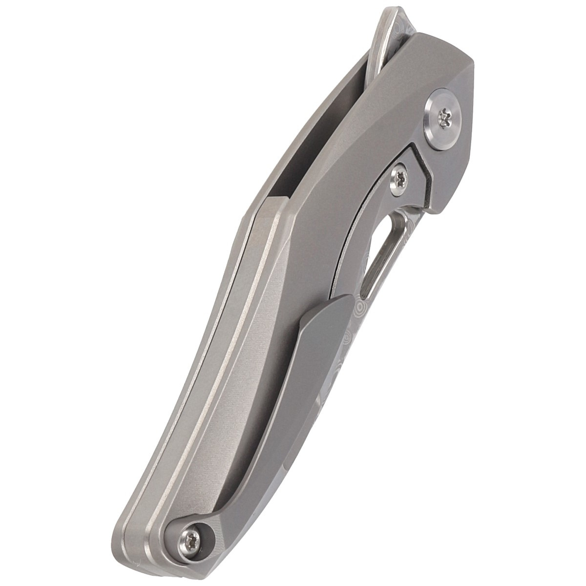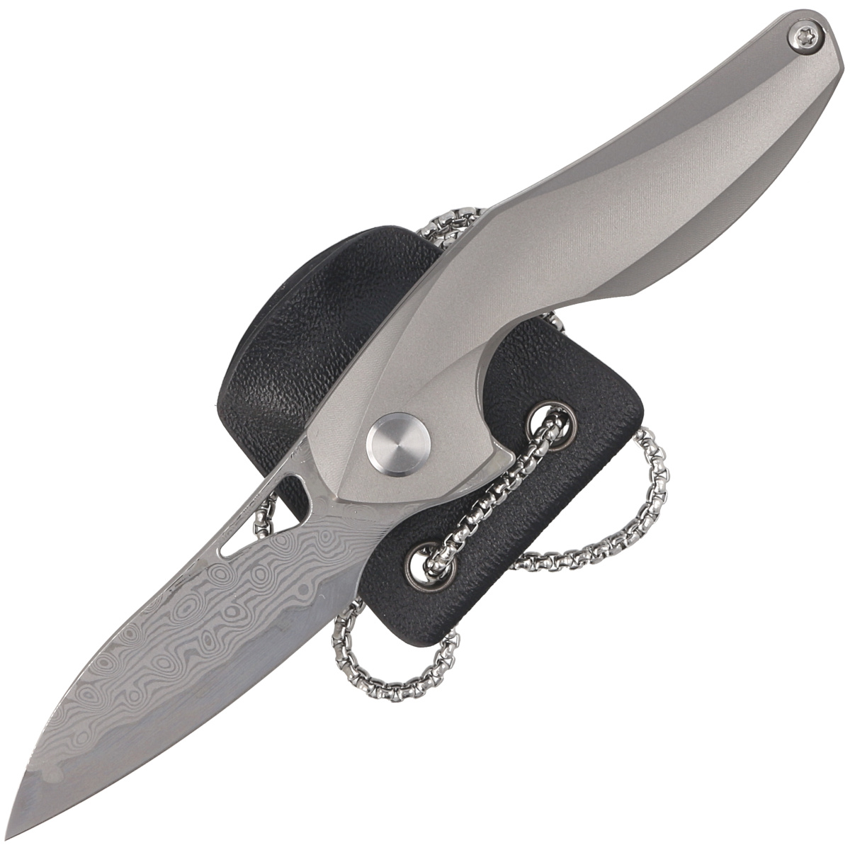 The Reticulan Grey Titanium, Damascus an undersized elegant folding knife with a scabbard suitable for hanging around the neck. Designed by renowned knifemaker and designer Elijah Isham. The appearance of The Reticulan clearly highlights Elijah Isham's design style. His designs are often enhanced with artistic organic shapes and wavy lines. Without a doubt, The Reticulan is an extraordinary knife that will make you stand out from the crowd!