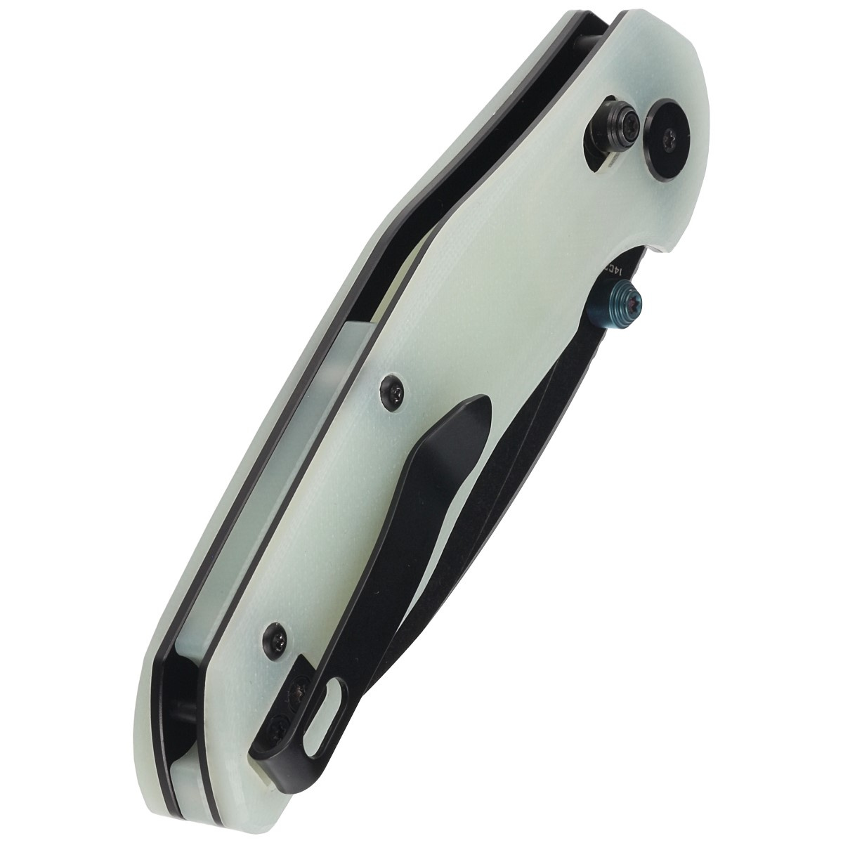 Handle - the liners of translucent green G10 (pressure-pressed fiberglass with synthetic resin), textured to improve grip confidence, are bolted to the knife's steel frame. The massive backspacer to which the liners are attached guarantees the rigidity and strength of the entire structure. The simple, solid construction gives the assurance of many years of use. Pivot decorated with a stylized logo of the manufacturer. Single-position (right) steel deep-carry clip allows you to carry the knife discreetly in your pocket in tip-up position (blade tip up).