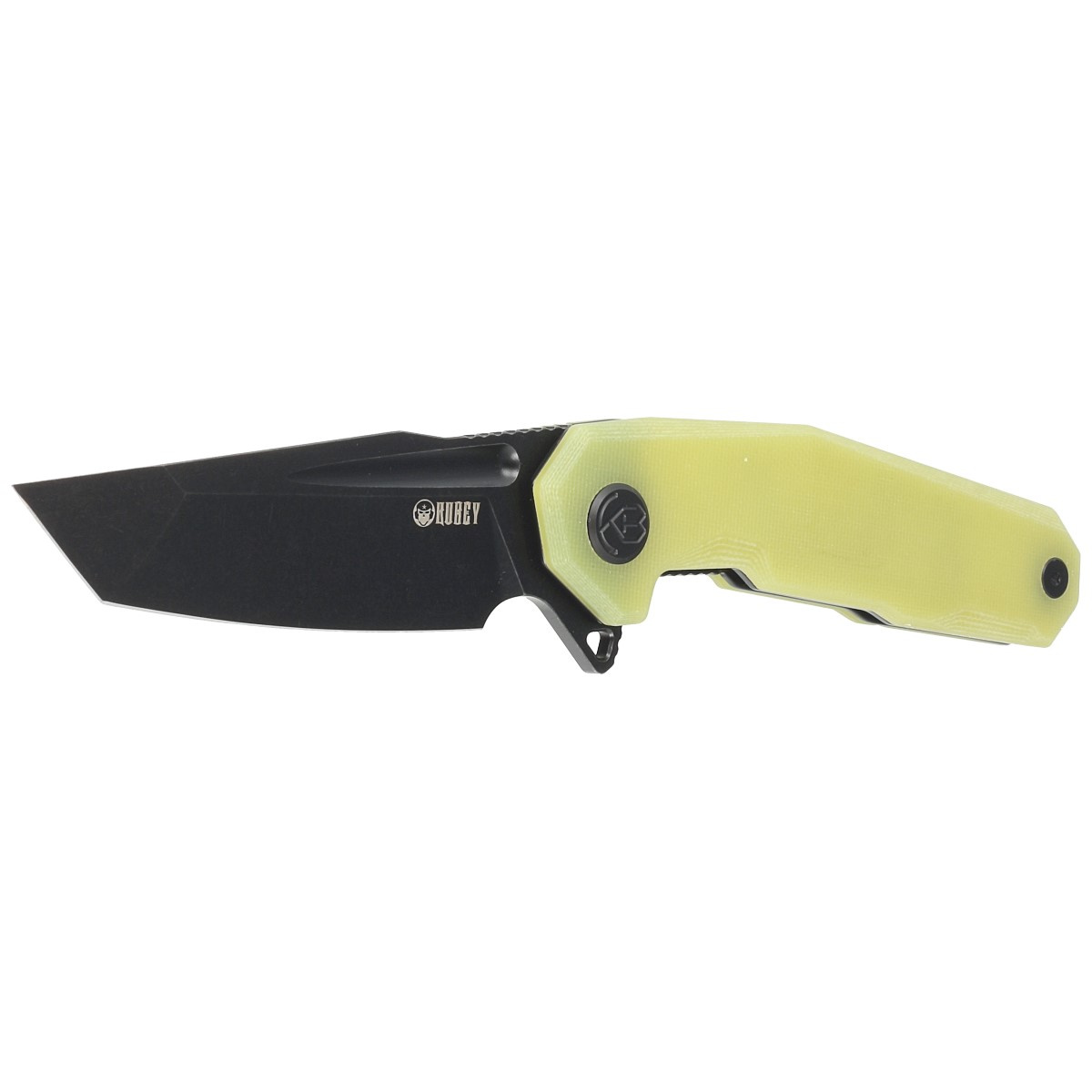 Handle – crafted from translucent yellow G10 composite scales with textured surfaces to enhance grip security - bolted to the knife's steel frame. The open-backed construction, fastened with steel standoffs, reduces weight and facilitates easy cleaning. This simple yet robust design ensures years of reliable use. A deep, contoured fore finger groove improves grip confidence, while the pivot axle is adorned with the stylized Kubey Knife logo. The knife features a single-position, right-side metal deep-carry clip, allowing for discreet pocket carry in a tip-up position.