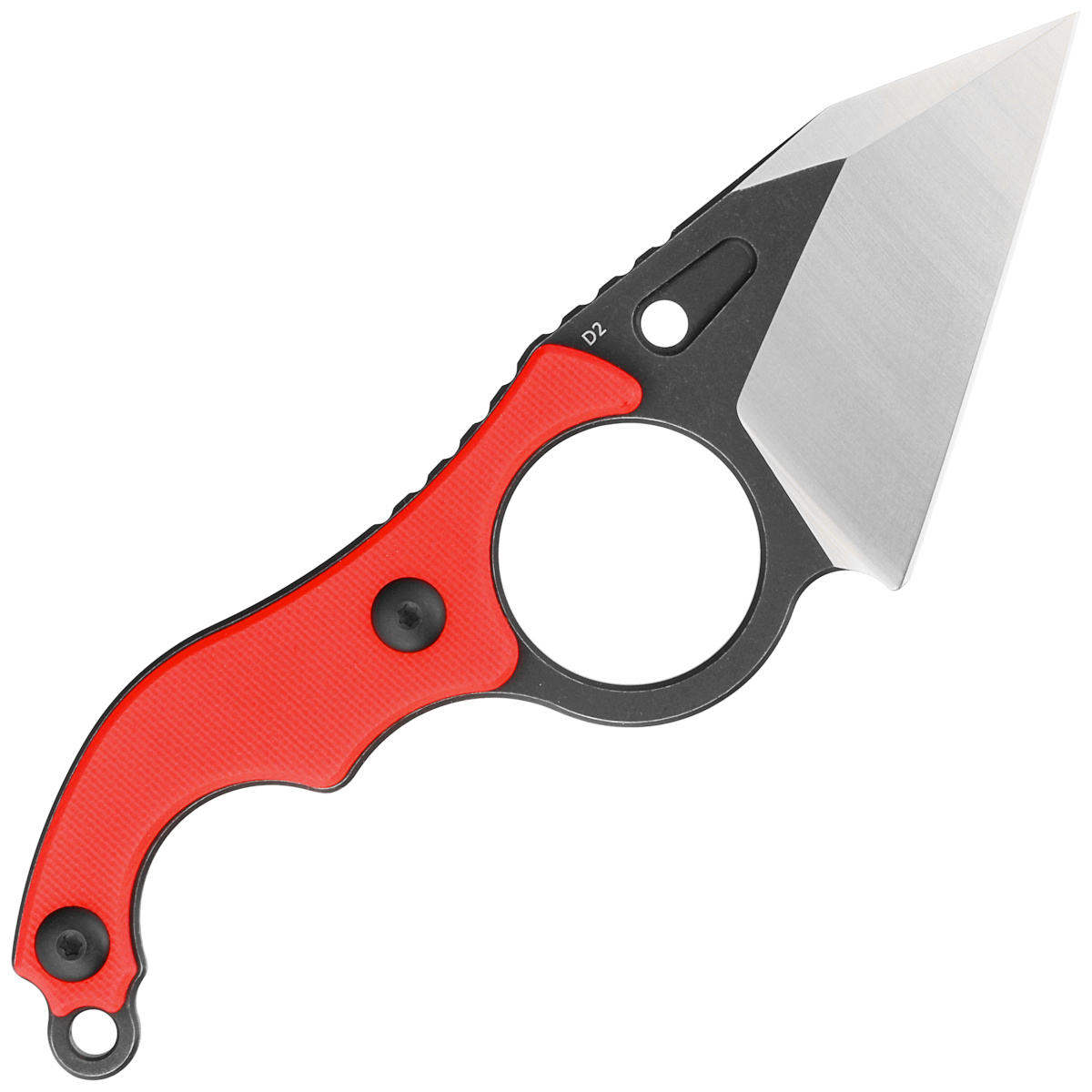 Hippocam Red G10, Satin / Blackwashedfixed-blade knife with a monolithic construction made of D2 tool steel, providing high hardness and wear resistance. The handle is made of G10, ensuring light weight, durability, and a secure grip. The Kydex sheath, equipped with a multi-position mounting system, allows for various attachment configurations on a belt or gear and provides quick access to the blade.