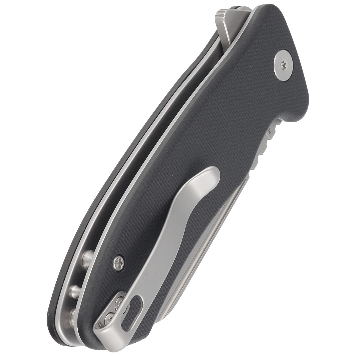 Handle - G10 (fiberglass compressed with synthetic resin) grips. Textured for improved grip confidence, bolted to the knife's steel frame. The so-called open-backed design without the typical backspacer, fastened together with steel spacers for easy cleaning. The simple, sturdy design gives assurance of many years of use. A deep finger undercut (fore finger groove) improves grip security. The pivot axis is decorated with a stylized manufacturer's logo. A two-position (right/left) steel deep carry clip allows you to carry the knife discreetly in your pocket in tip-up position (blade tip up).