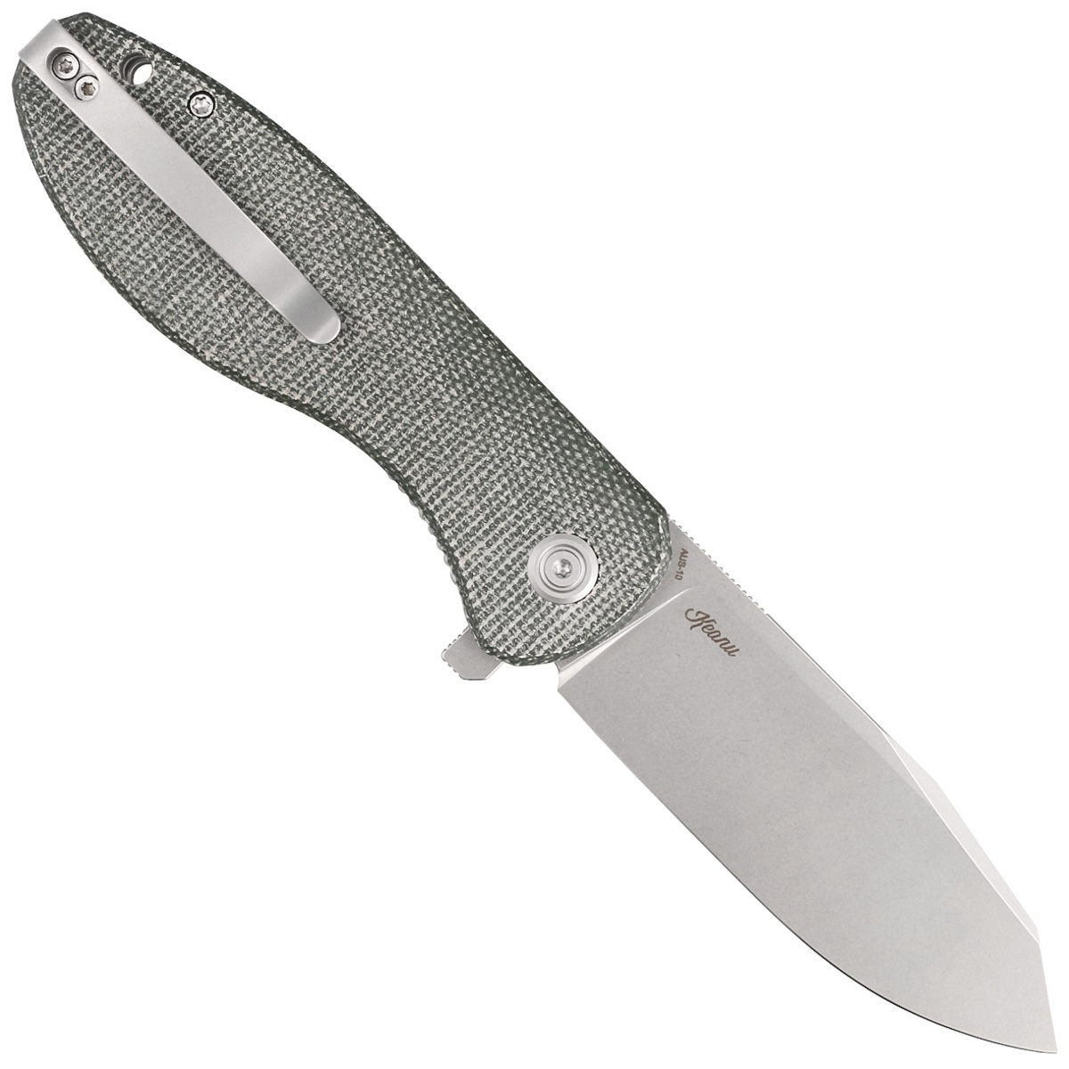 Handle - Micarta facings (pressure-pressed canvas with synthetic resin). Textured to improve grip confidence, screwed to the steel frame of the knife. The so-called open-backed design without the typical backspacer, fastened together with steel spacers for easy cleaning. The simple, sturdy design gives assurance of many years of use. Two-position (right/left) steel deep-carry clip allows you to carry the knife discreetly in your pocket in tip-up position (blade tip up). Above the clip a lanyard hole, a hole for threading a safety or decorative cord.