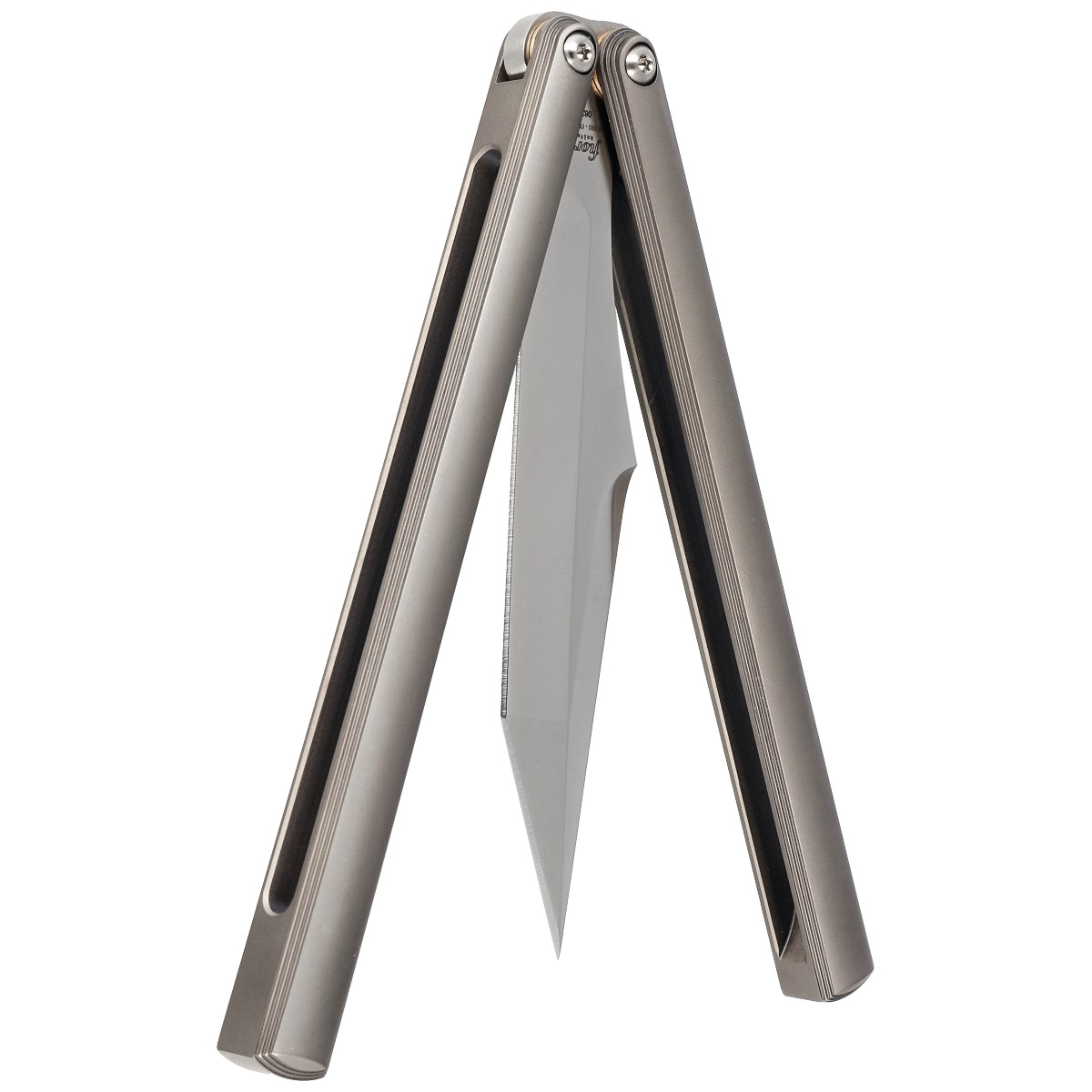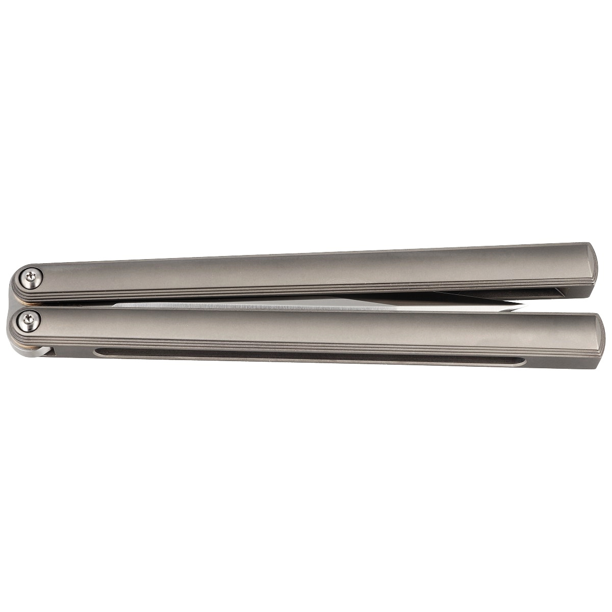 Handle - Bead Blasted titanium grips with a slightly rough texture. Chamfered edges of the covers eliminate sharp edges. Pivot axes set extremely close to each other due to the lack of stop pins. Such a solution allows for much smoother operation, making it easier to perform complex tricks. For the same reason, the designer dispensed with the bar that secures the arms in the open position, on the assumption that the main purpose of his balisong is to provide fun,