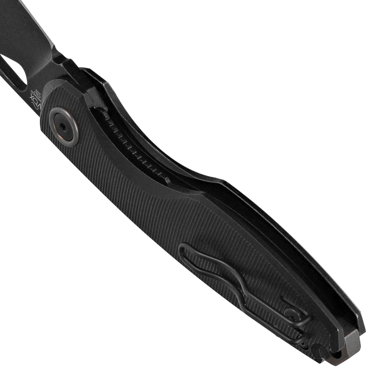 Handle - made of solid titanium 6AL4V in black. Chamfered edges of the sheaths eliminate sharp edges and texturing of the Handle improves grip comfort. The backspacer, oxidized to the color of old braze, provides rigidity and solidity to the whole structure. The same color is used for the decorative overlay around the pivot. A two-position (right/left) lightweight wire clip allows the knife to be carried in the tip-up position, with the tip of the blade upward. Above the clip a hole for threading a safety or decorative cord.