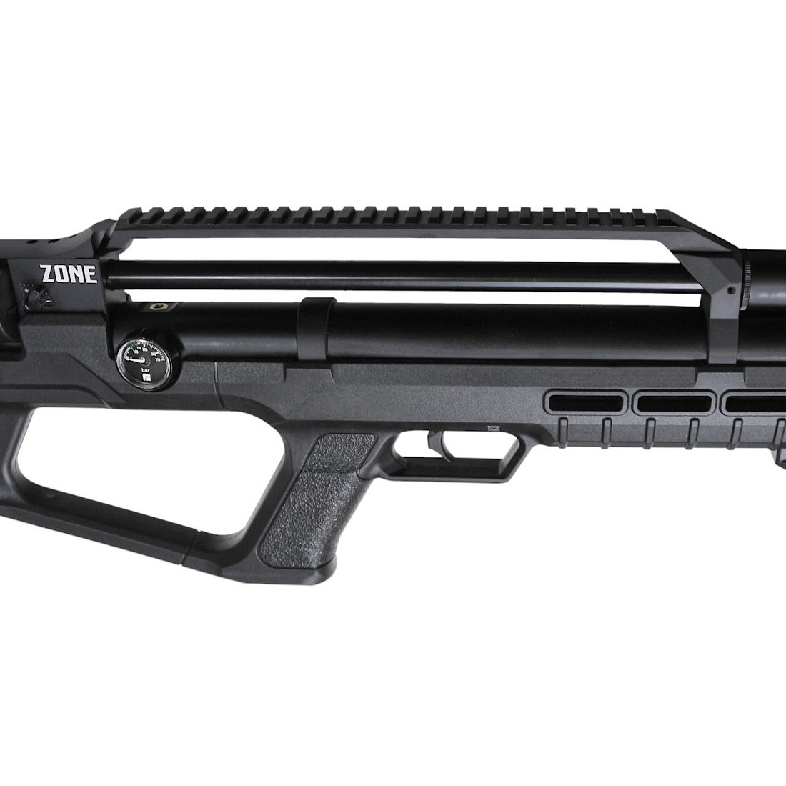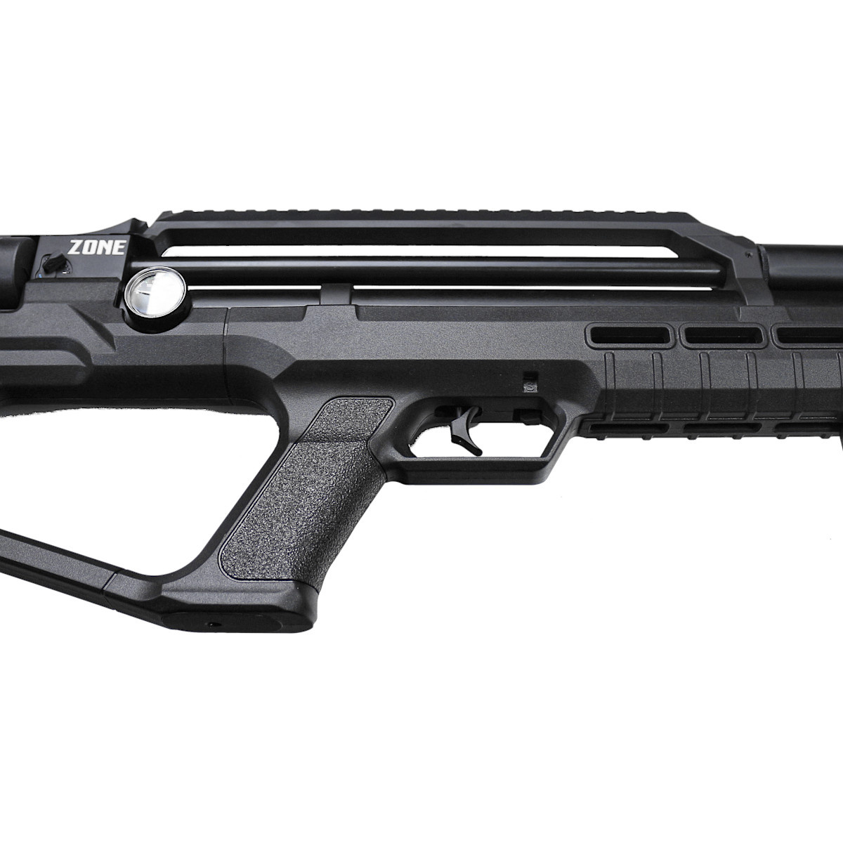 - Reximex Zone, PCP air rifle with with adjustable shot power in a bullpup design, Side Lever reload , regulator and barrel with integrated suppressor. Available in calibers: 4.5mm, 5.5mm, 6.35mm.