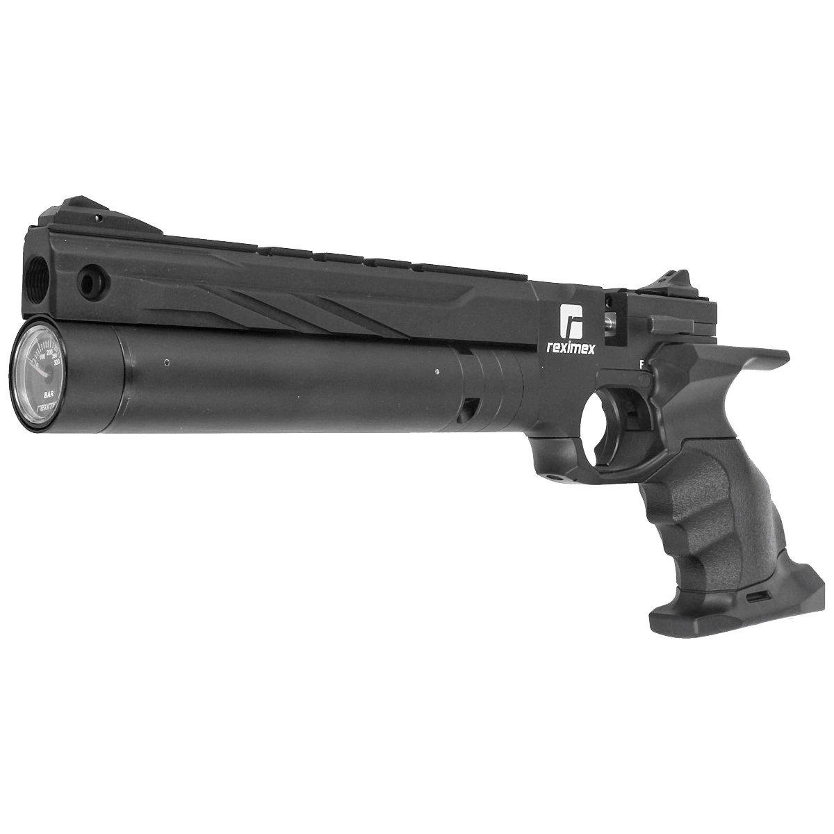Reximex RP Black, a PCP sporting pistol with a regulator for repeatable shots. Adjustable pin barrel and trigger tongue. Pressure vessel with a capacity of. 50cc. Anatomical handle with shelf with flask attachment option. Cal. 4.5mm, 5.5mm