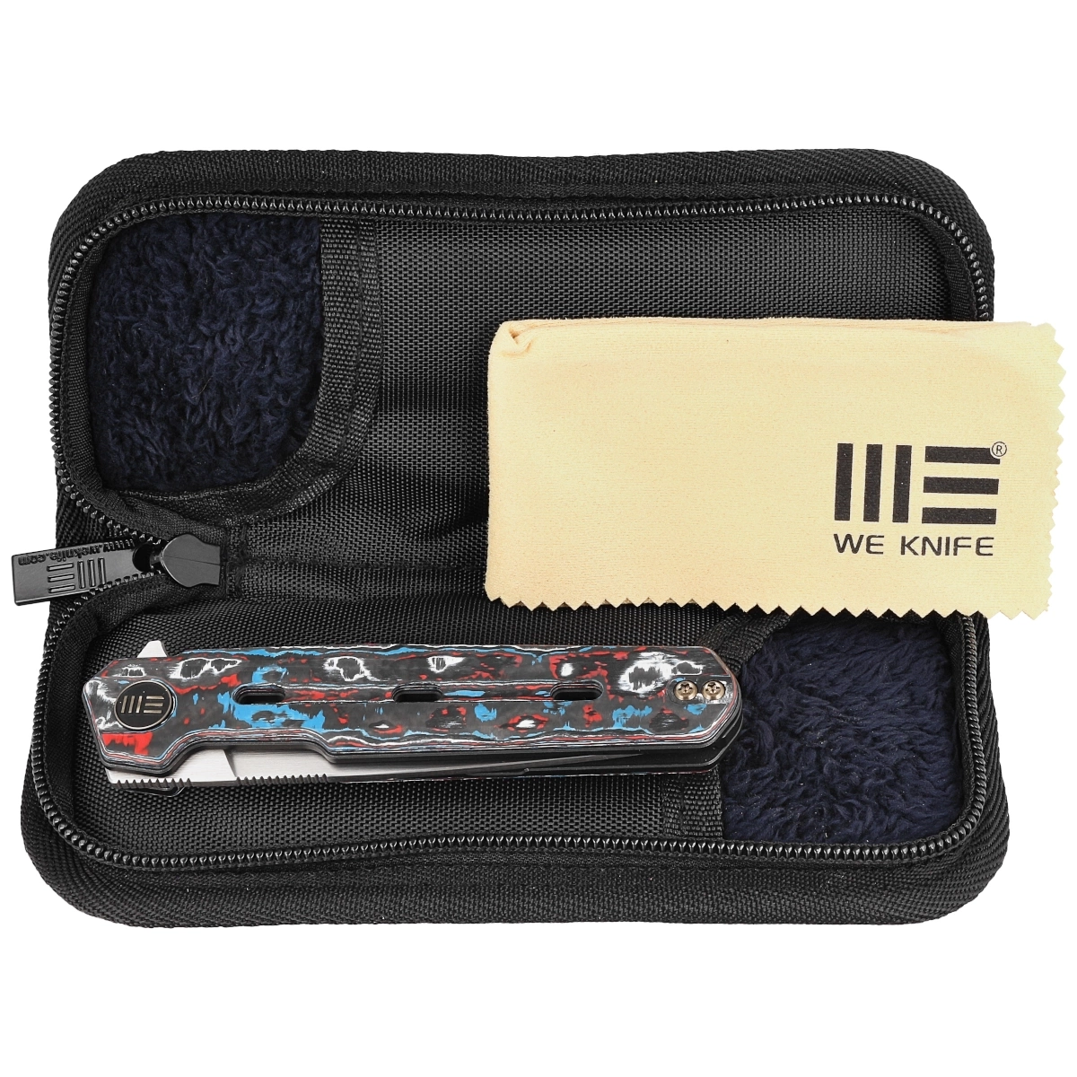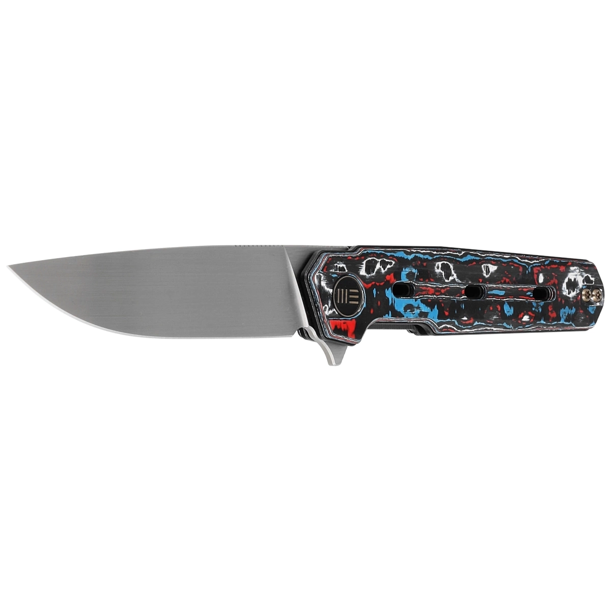 Handle - grips made of Nebula Fat Carbon Fiber (colored carbon fiber compressed under pressure with synthetic resin) attached to 6AL4V titanium liners. Chamfered edges of the covers eliminate sharp edges. The grips are screwed to an intricately machined titanium backspacer, giving assurance of many years of use. The pivot axis is decorated with a stylized WE Knife brand logo. A two-position (right/left) titanium deep-carry clip allows you to carry the knife discreetly in your pocket in the tip-up (blade tip up) position. On the back of the Handle a lanyard hole, hidden in the backspacer, a place for a decorative or safety line.