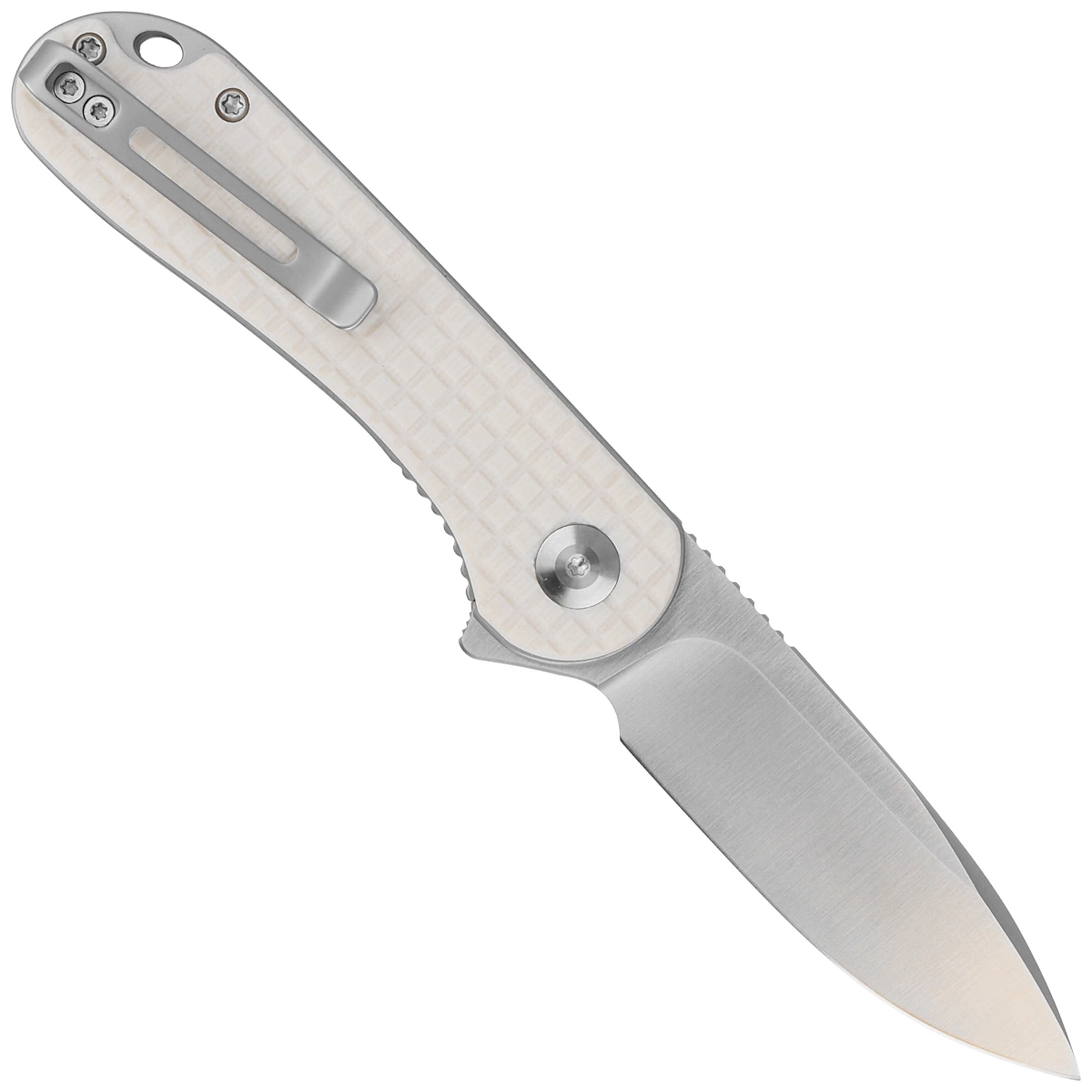 Handle - white G10 plastic grips, textured in an intricate "3D cube" pattern for improved grip security. The whole thing is attached to steel liners. In practice, this means many years of service without weakening the structure. The so-called open-backed design without the typical backspacer, attached to each other with steel spacers for easy cleaning in the field. The pivot axis is decorated with a stylized Civivi brand logo. A right-side metal deep-carry clip allows you to carry the knife discreetly in your pocket in tip-up (blade up) position. Above the clip a lanyard hole, an oval hole for a cord.