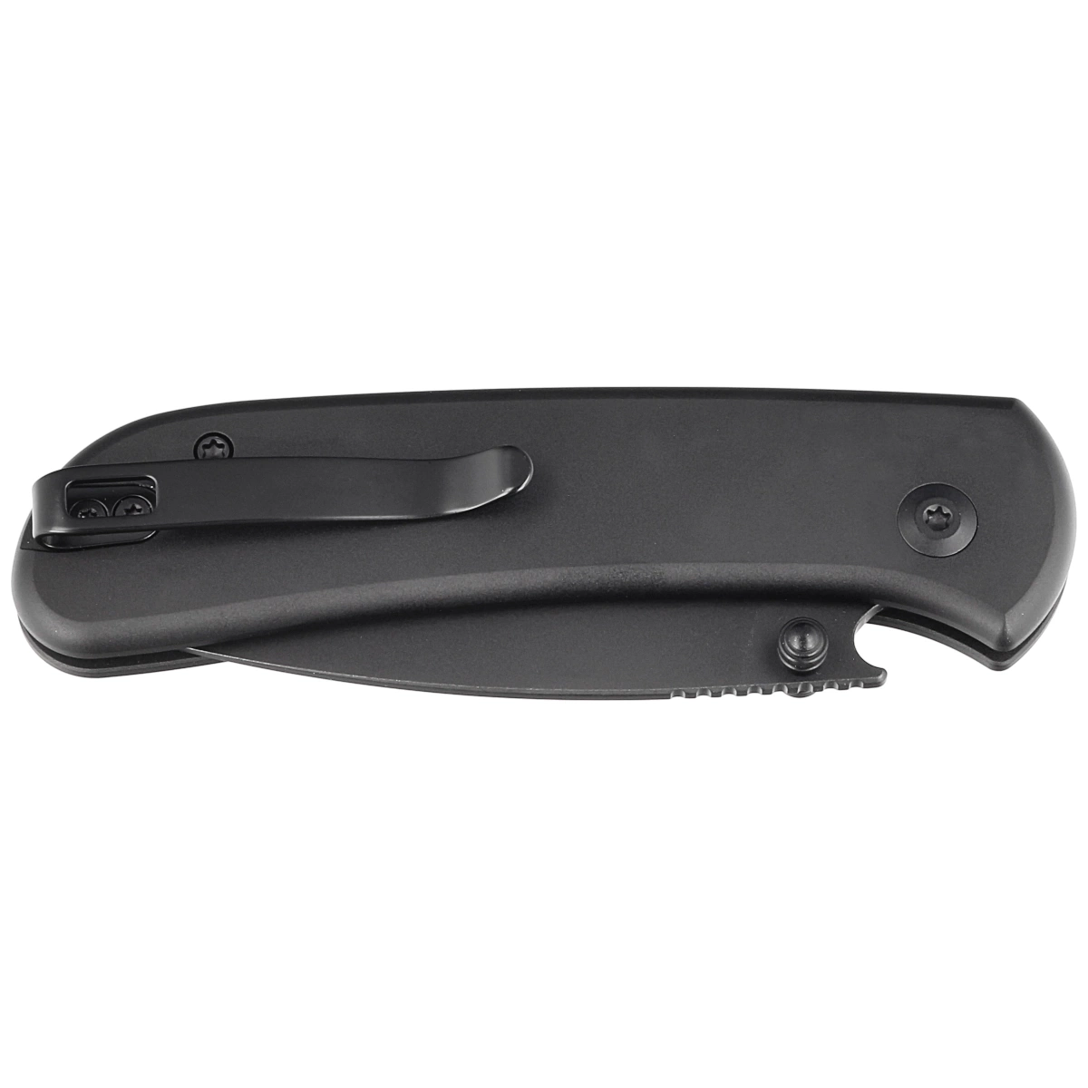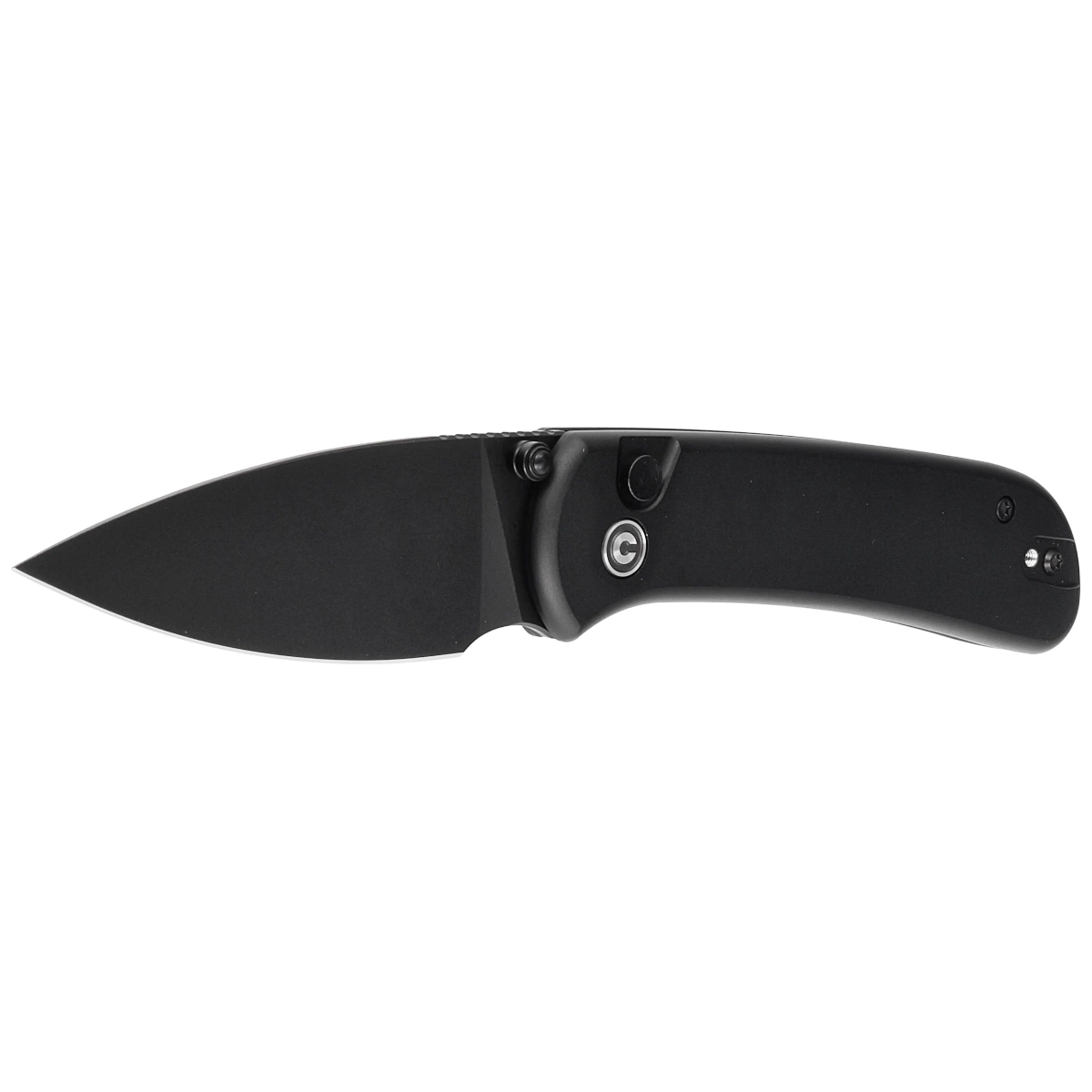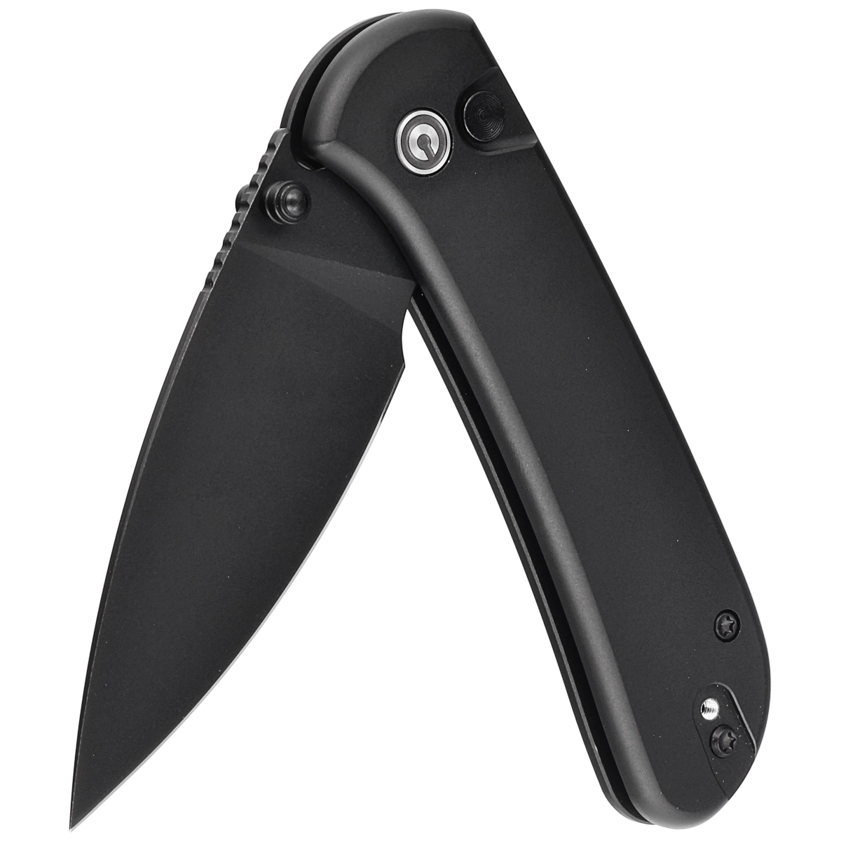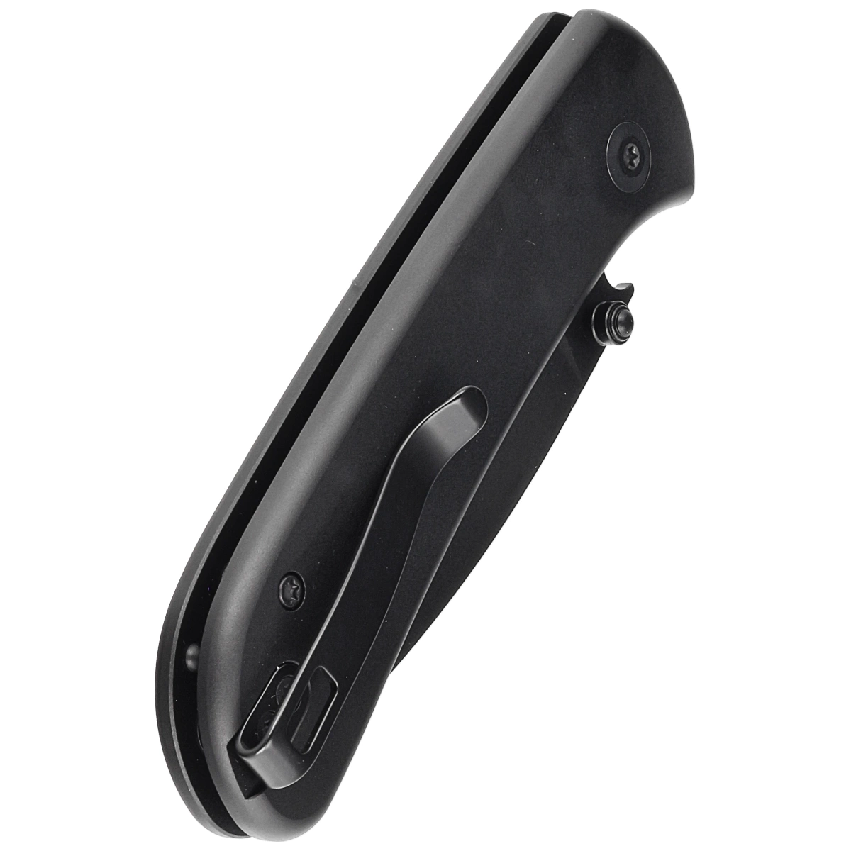 Handle - in black. Made of polished aluminum, whose beveled edges of the covers eliminate sharp edges for comfort, and the fore finger groove made on the front improves grip security. The open-backed design, fixed with steel spacer sleeves, reduces weight and facilitates cleaning. The pivot axis is decorated with a stylized Civivi brand logo. A two-position, right/left deep carry clip allows you to carry the knife discreetly in your pocket in tip-up position (blade tip up).