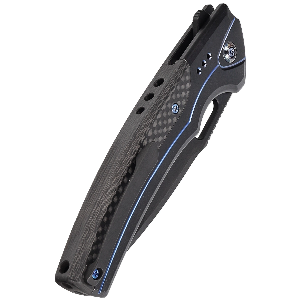 Handle - made of solid titanium 6AL4V anodized black with blue accents. Contouring of the covers eliminates sharp edges. Grips are joined together using Carbon integral backspacer with Twill pattern. The textured surface improves grip confidence. The simplicity and robustness of the design give confidence in many years of use. The single-position clip (right), made of titanium, allows the knife to be carried in tip-up position. The pivot axis is decorated with a circle of stained titanium.