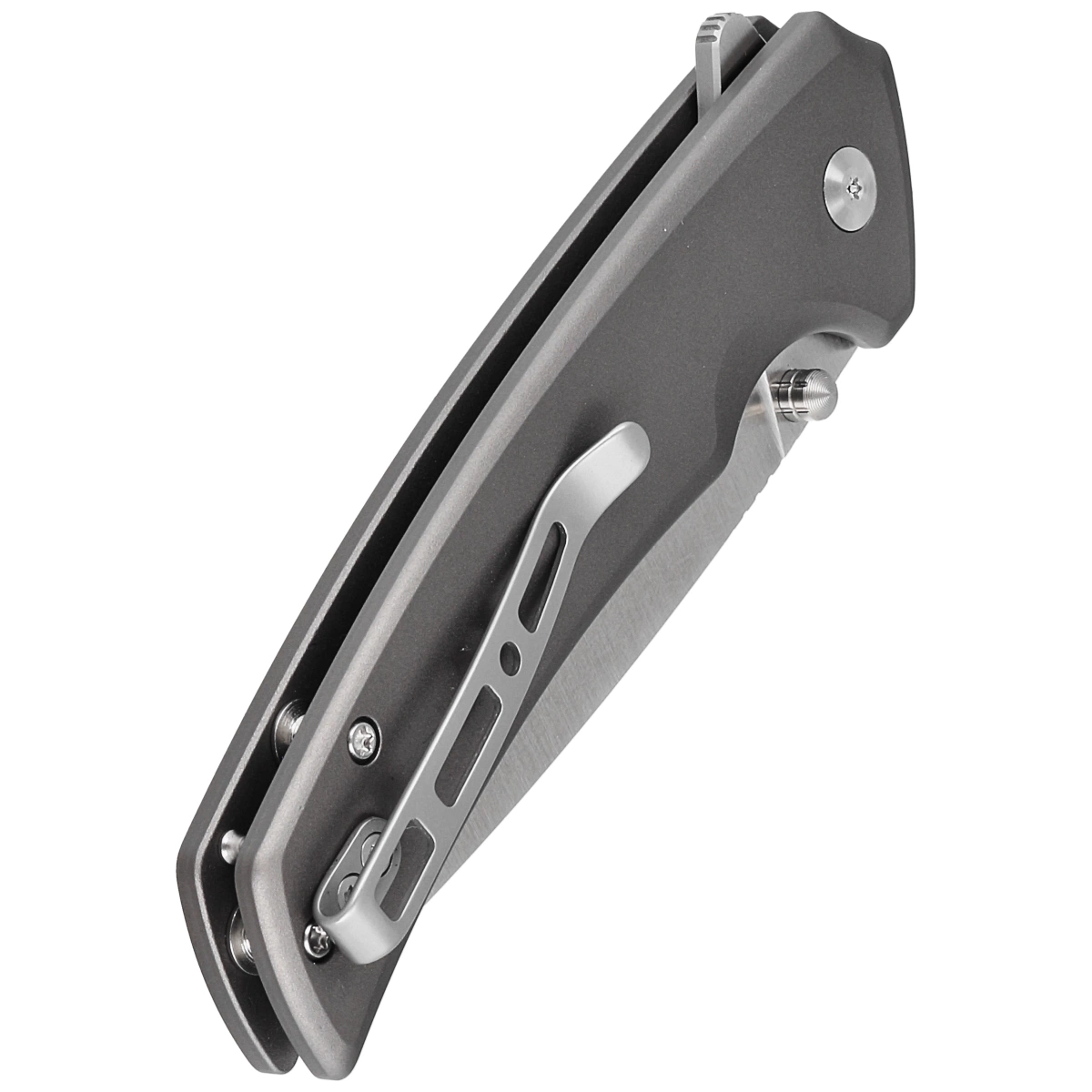 Handle - in gray color. Made of aluminum, whose beveled edges of the covers eliminate sharp edges for comfort, and the fore finger groove made on the front improves grip security. The open-backed design, fixed with steel spacer sleeves, reduces weight and facilitates cleaning. Two-position, right/left deep carry clip allows you to carry the knife discreetly in your pocket in tip-up position (blade tip up).