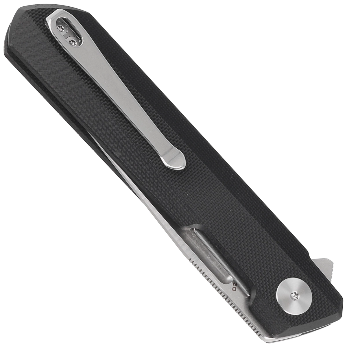 Handle - made of G10, a composite fiberglass material compressed with synthetic resin. The aggressive texture of the grips provides a firm grip, even with wet hands. The cover's chamfered edges eliminate sharp edges for comfort, and the finger indentation made on the front improves ergonomics. The open-backed design fixed with steel spacer sleeves reduces weight and makes cleaning easier. A two-position right/left deep carry clip allows you to carry the knife discreetly in your pocket in tip-up position (blade tip up).
