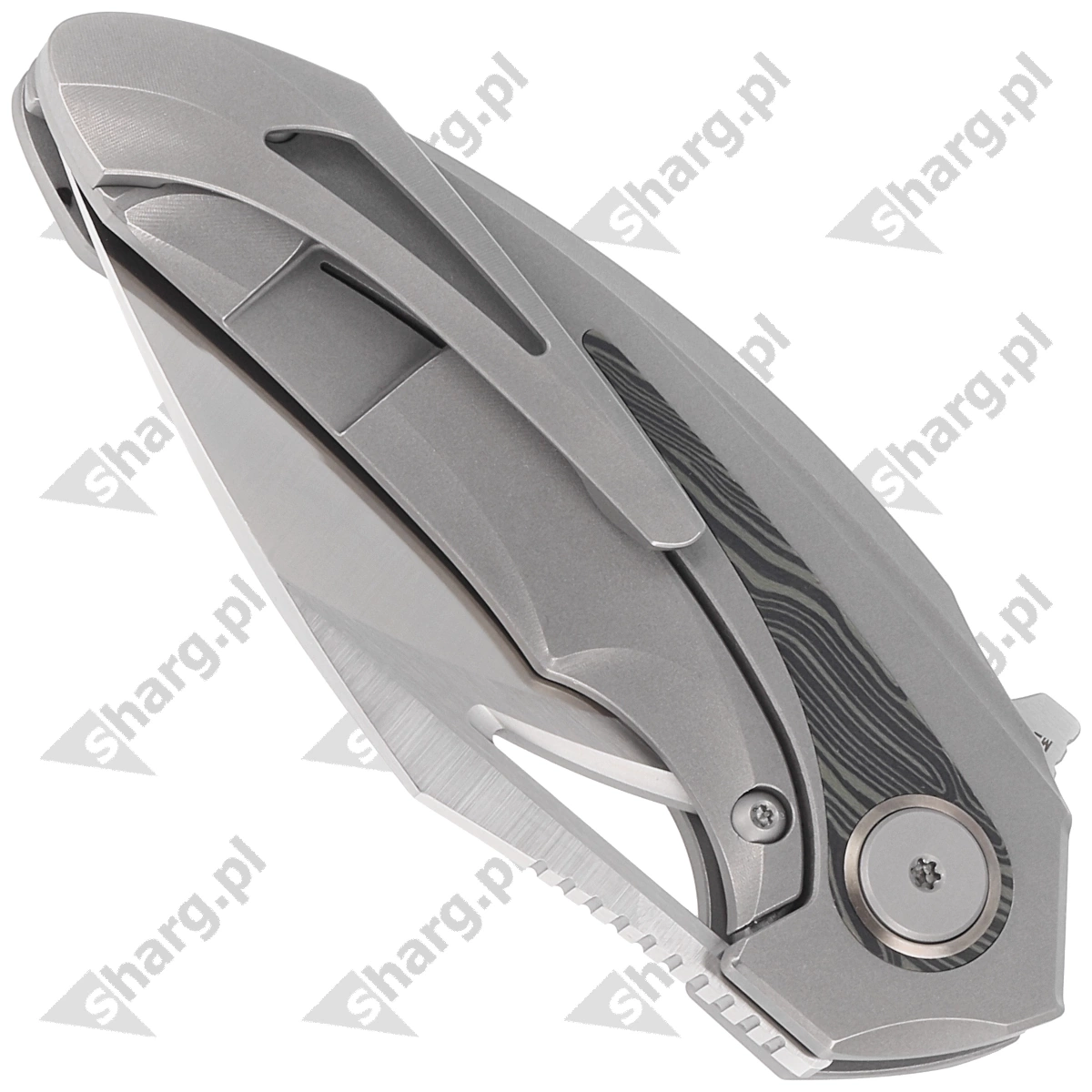 Handle - is two pieces of solid sandblasted titanium 6AL4V with striking green G10 inserts. The chamfered edges of the covers eliminate sharp edges for comfort, and the fore finger groove improves grip security. The solid titanium backspacer to which the grips are attached guarantees the rigidity and strength of the entire structure. A single-position, right-handed titanium clip allows the knife to be carried in tip-up position, with the tip of the blade upward.