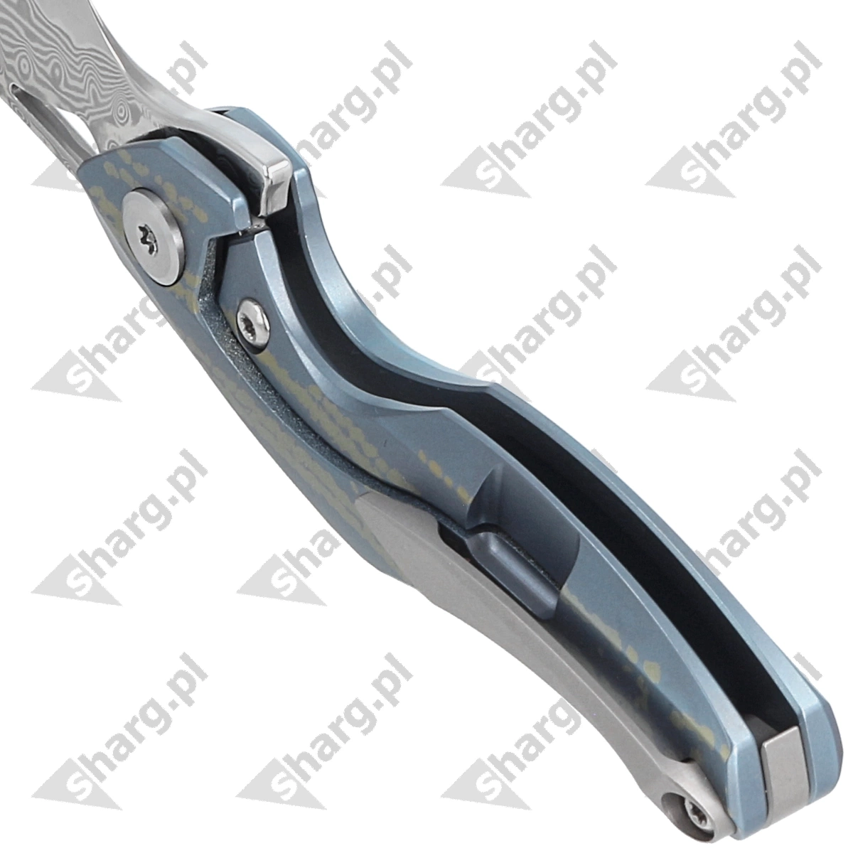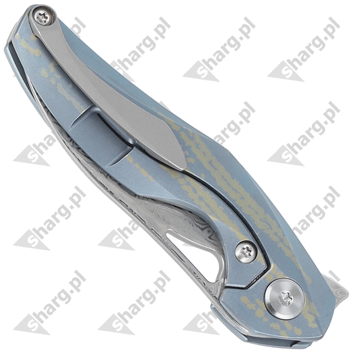 Handle - made of solid titanium 6AL4V. The handle has been heat-treated to achieve a unique blue-based color pattern. Chamfered edges of the covers eliminate sharp edges for comfort and improve grip security. The solid titanium backspacer to which the grips are attached guarantees the rigidity and strength of the entire structure. A deep finger undercut (fore finger groove) improves grip confidence. A single-position, right-hand titanium clip allows the knife to be carried in tip-up position, with the tip of the blade upward.