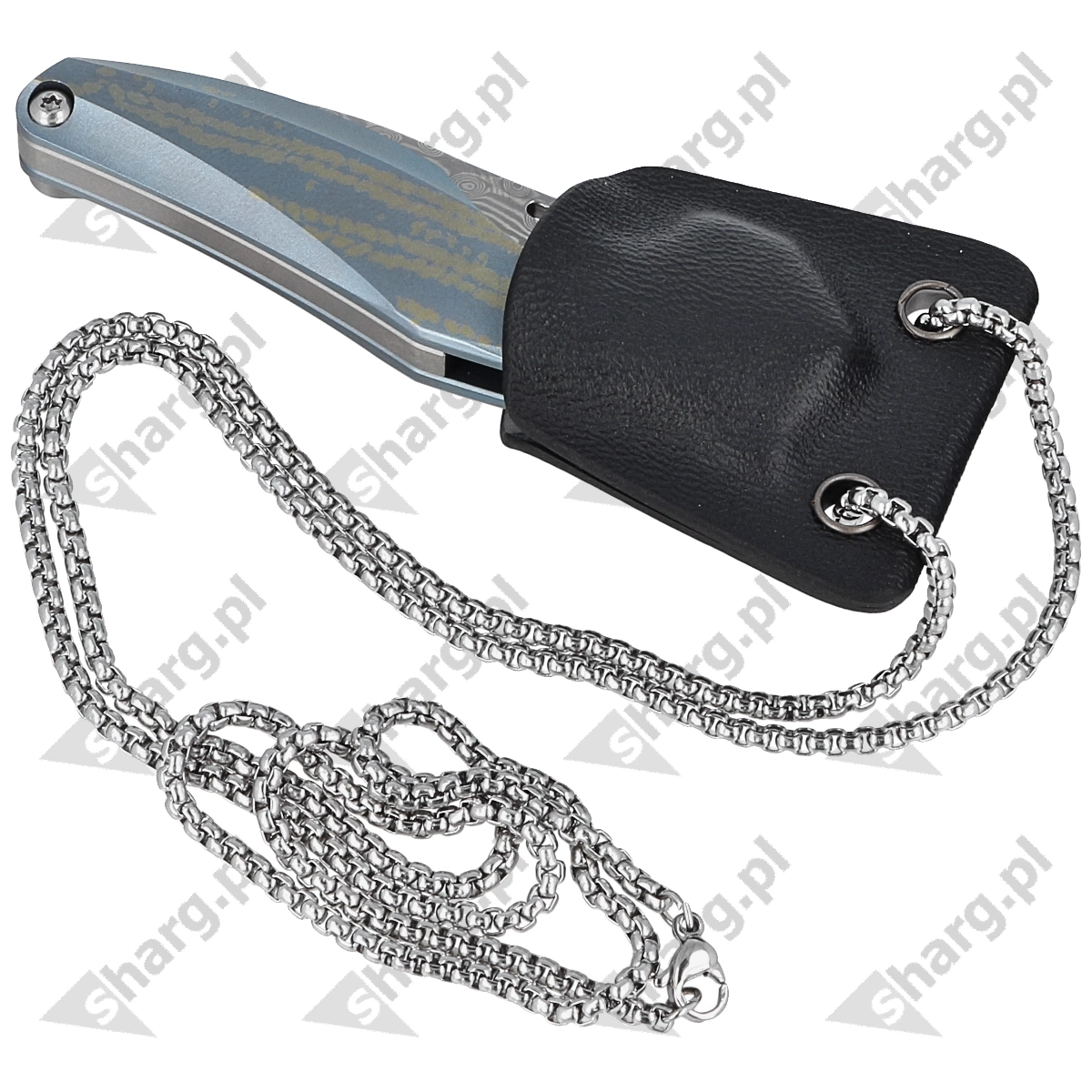 The Reticulan Blue / Colorful Titanium, Damascus, an undersized elegant folding knife with a scabbard suitable for hanging around the neck. Designed by renowned knifemaker and designer Elijah Isham. The appearance of The Reticulan clearly highlights Elijah Isham's design style. His designs are often enhanced with artistic organic shapes and wavy lines. Without a doubt, The Reticulan is an extraordinary knife that will make you stand out from the crowd!