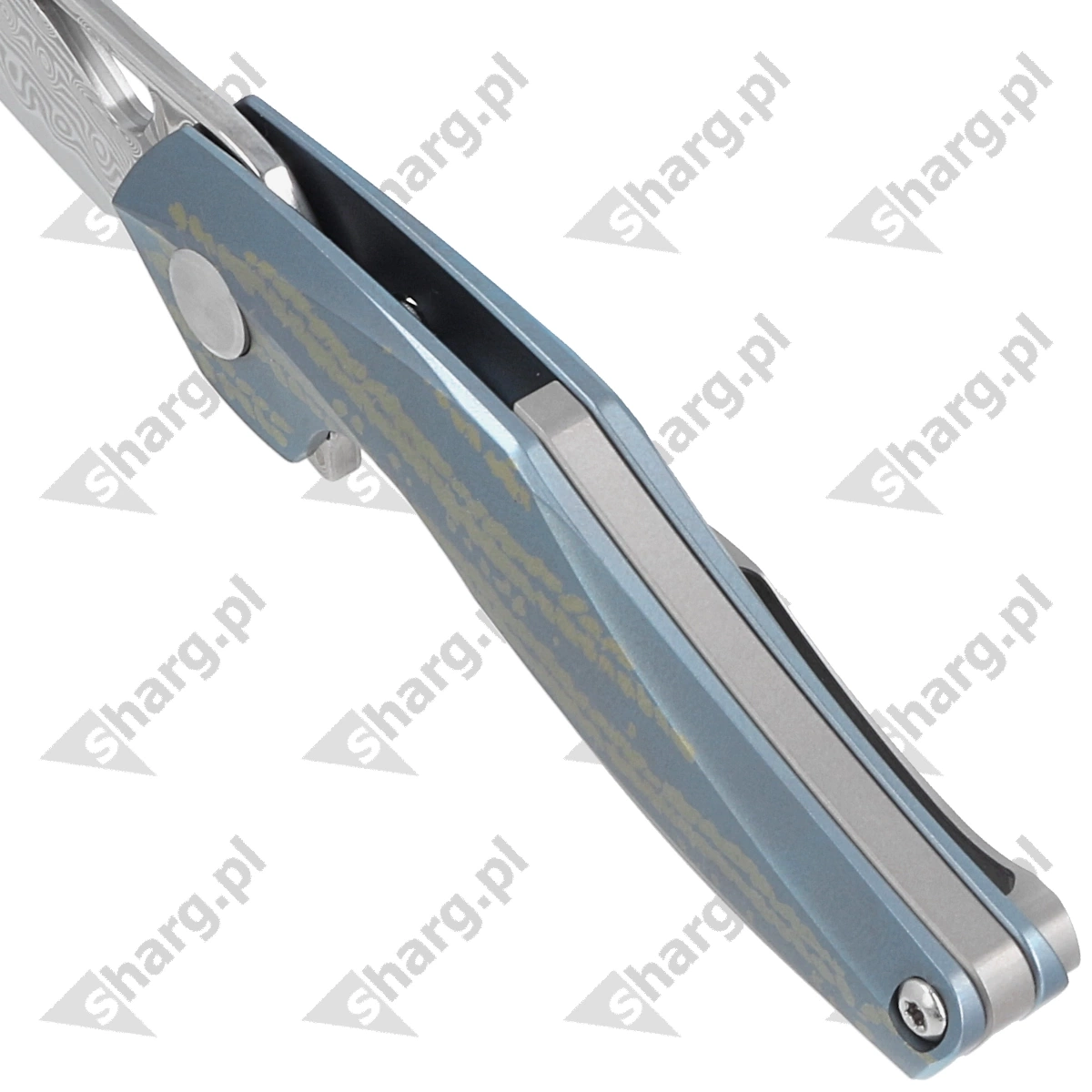 Blade - sheepsfoot type with an aggressive shape, finished with etching that emphasizes the unique damascus patterns The small thickness of the blade combined with a high flat grind (Flat Grind) gives an excellent cutting edge geometry and extreme cutting performance. Ceramic ball bearings support the smooth operation of the blade's opening mechanism, which can be opened with a quick flipper flipper (index-finger flipper), so it can be easily used by right- and left-handed people. We can also open it using a hole in the wedge. On the back of the wedge a slight recess where we can place our thumb for more precise work. The whole thing is locked with a proven and popular frame lock with a steel insert to prevent wiping of the lock face.