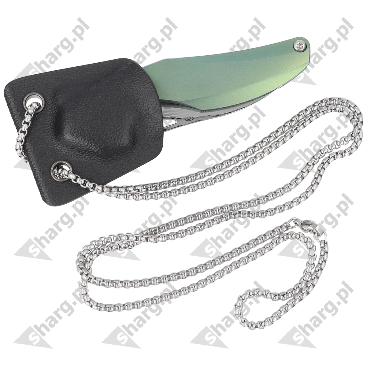 The Reticulan Green Titanium, Damascus an undersized elegant folding knife with a scabbard suitable for hanging around the neck. Designed by renowned knifemaker and designer Elijah Isham. The appearance of The Reticulan clearly highlights Elijah Isham's design style. His designs are often enhanced with artistic organic shapes and wavy lines. Without a doubt, The Reticulan is an extraordinary knife that will make you stand out from the crowd!