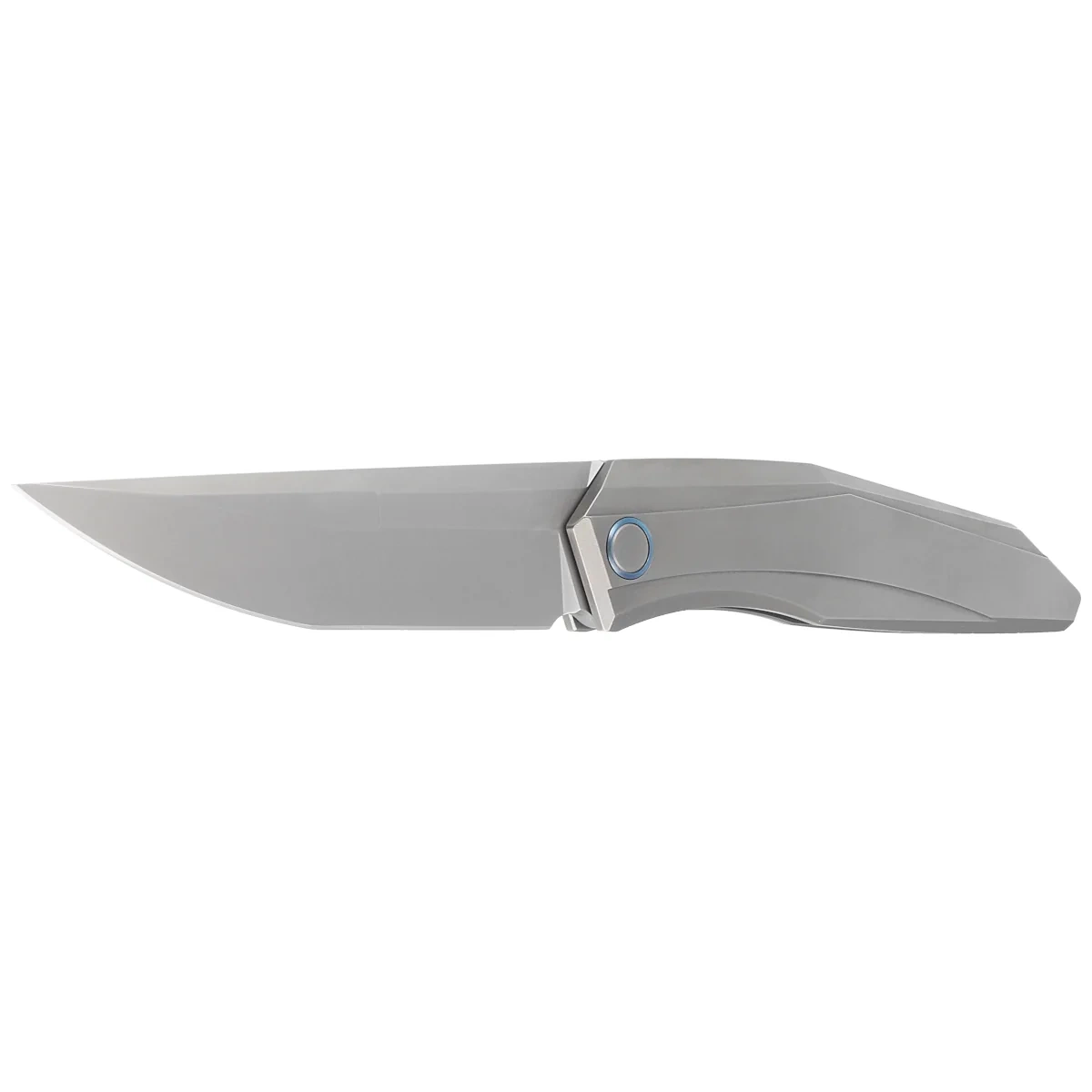 Handle - these are thick pieces of 6AL4V titanium, beautifully milled using 3D CNC machine tools into geometric patterns. Only a few companies are able to make the Handle with such incredible accuracy! The titanium backspacer to which the grips are attached guarantees the rigidity and strength of the entire construction. The simplicity and robustness of the construction ensure many years of use. The single-position (right) clip, made of titanium, allows the knife to be carried in the tip-up position. The pivot axis is decorated with a blue anodised rim (pivot cap collar). Hidden in the back is a place to thread a safety or decorative cord.