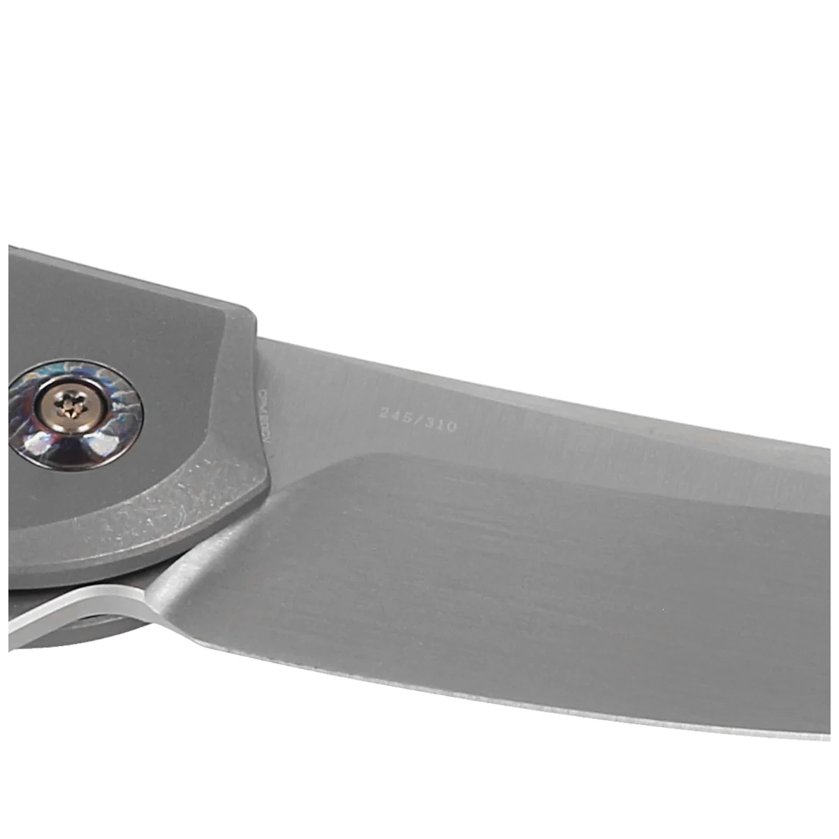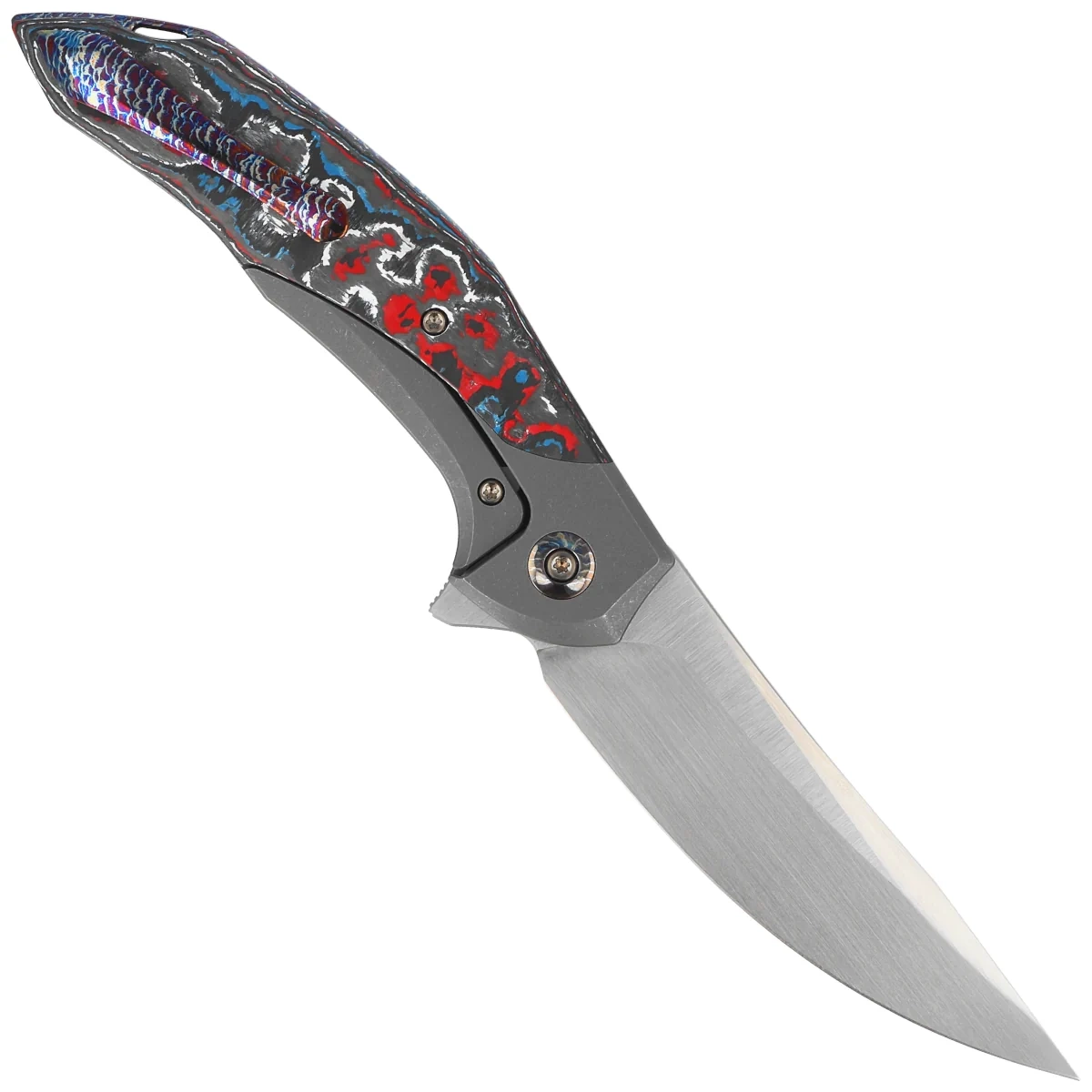 Handle - made of 6AL4V titanium and Fat Carbon Nebula (coloured carbon fibre compressed under pressure with synthetic resin). Contouring of the covers eliminates sharp edges. The grips are bonded together with a titanium backspacer. The surface texture improves grip security. The simplicity and robustness of the construction ensure many years of use. The single-position (right) clip, made of heat-stained titanium, allows the knife to be carried in the tip-up position. At the top of the backspacer there is a place to thread a safety or decorative cord. As on other models, the pivot is decorated with a stylised manufacturer's logo.