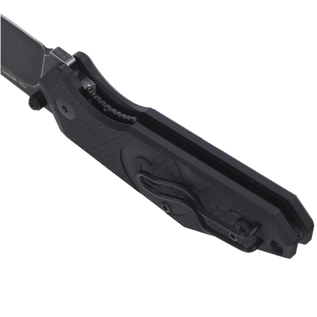 Handle - grips made of G10 (pressure-pressed fiberglass with synthetic resin), textured to improve grip confidence, are bolted to the knife's steel frame. The whole is stiffened by a solid backspacer. The simple, sturdy design gives you the assurance of many years of use. A two-position (right/left) metal deep-carry clip allows you to carry the knife discreetly in your pocket in tip-up position (blade tip up). On the back of the Handle a lanyard hole, a hole for threading a safety or decorative cord.