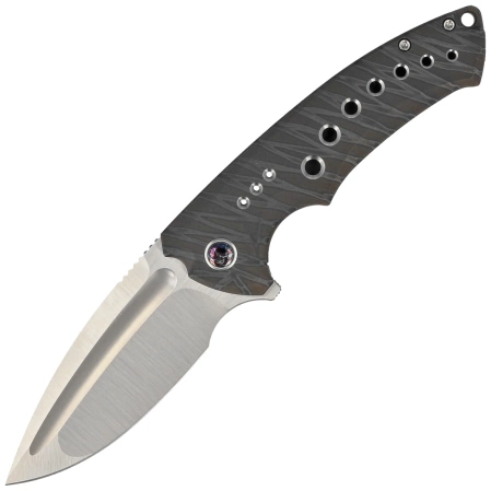 Handle - is a thick piece of 6AL4V titanium, beautifully milled with the help of CNC machine tools and heat dyed in a tiger stripe pattern. Holes adding visual lightness in titanium color. Only a few companies are able to make a Handle with such incredible accuracy! The titanium backspacer to which the grips are attached guarantees the rigidity and strength of the entire structure. The simplicity and solidity of the construction give the assurance of many years of use. The single-position clip (right), made of titanium, allows you to carry the knife in tip-up position. The pivot is made of flame-dyed titanium and decorated with a titanium rim (pivot collar cap). In the protruding part of the backspacer you will find a place for threading a safety or decorative cord.
