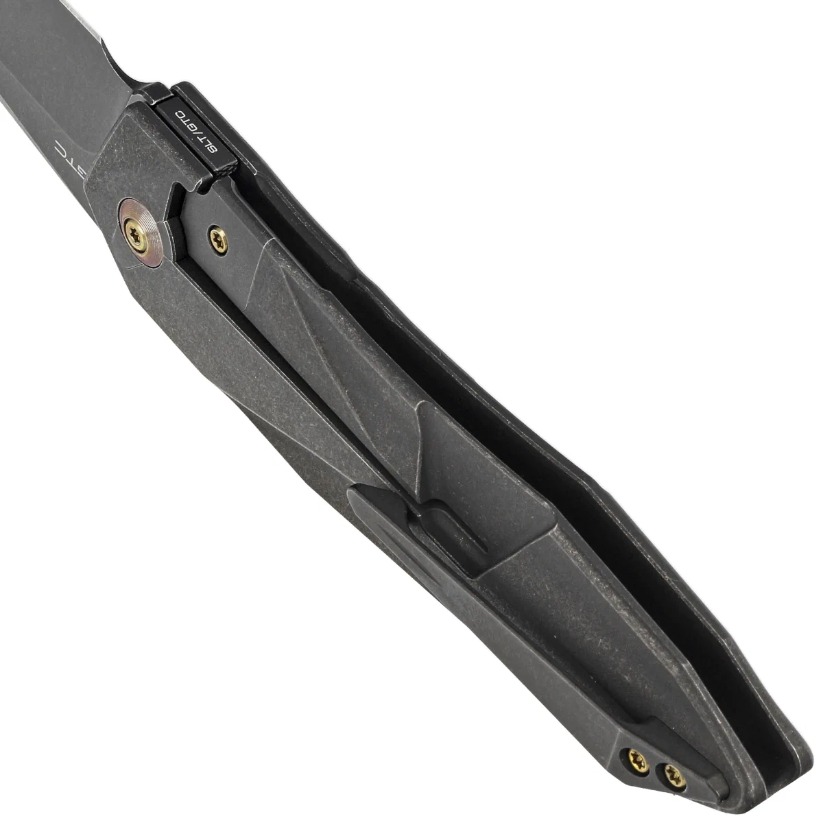Handle - from a single piece of titanium 6AI4V, machined on CNC milling machines. Monolithic skeleton (body) of the highest strength, which is a solid structural element that guarantees the rigidity and strength of the entire structure. Only a few companies are able to make the Handle with such incredible accuracy! The simplicity and solidity of the design give you the assurance of many years of use. Single-position clip (right), made of titanium, allows you to carry the knife in tip-up position. The pivot is made of flame-dyed titanium and decorated with a gold rim (pivot collar cap).