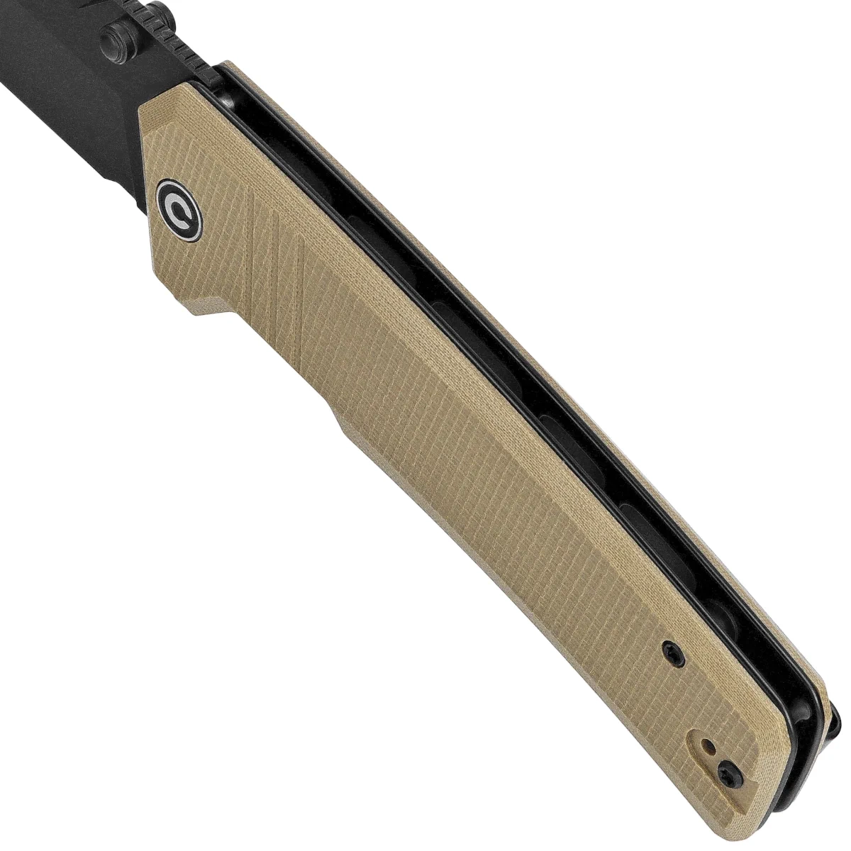 Handle - made of G10, a composite fibreglass material compressed with synthetic resin. The chamfered edges of the covers eliminate sharp edges and the textured surface increases comfort and grip. The open-backed design, fixed with steel spacer sleeves, reduces weight and facilitates cleaning. The pivot is decorated with a stylised Civivi brand logo. The two-position, right/left deep carry clip allows the knife to be carried discreetly in the pocket in the tip-up position (blade tip upwards).