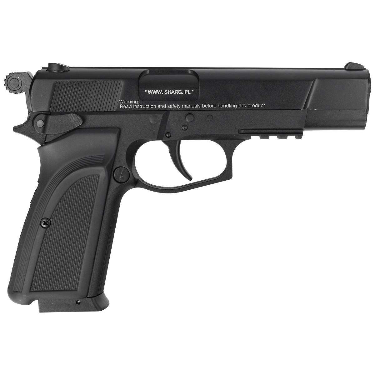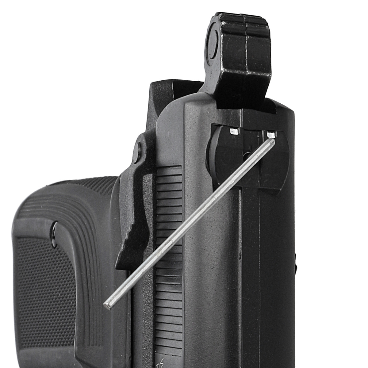 Frame – made of hardened, lightweight polymer with an integrated Picatinny accessory rail (MIL-STD 1913). The combination of the polymer frame and fully metal slide gives the pistol a highly realistic appearance, nearly indistinguishable from a real firearm. It features a generously sized integral trigger guard for comfortable two-handed shooting. The grip panels are made of durable black ABS with a textured surface, ensuring a stable and secure hold.