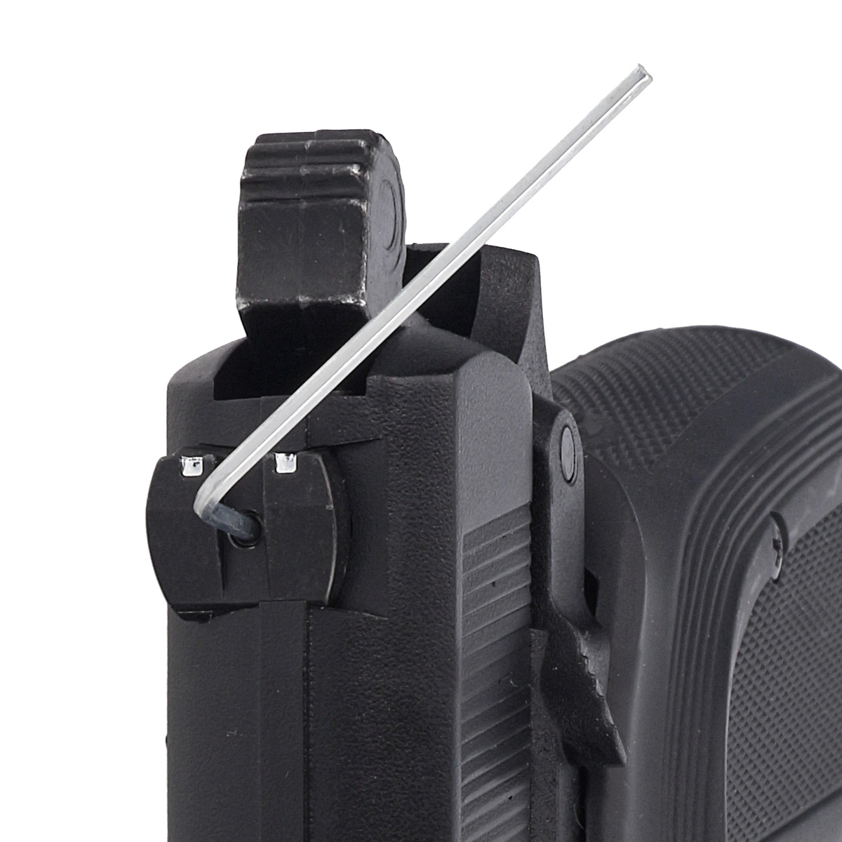 Frame – made of hardened, lightweight polymer with an integrated Picatinny accessory rail (MIL-STD 1913). The combination of the polymer frame and fully metal slide gives the pistol a highly realistic appearance, nearly indistinguishable from a real firearm. It features a generously sized integral trigger guard for comfortable two-handed shooting. The grip panels are made of durable black ABS with a textured surface, ensuring a stable and secure hold.