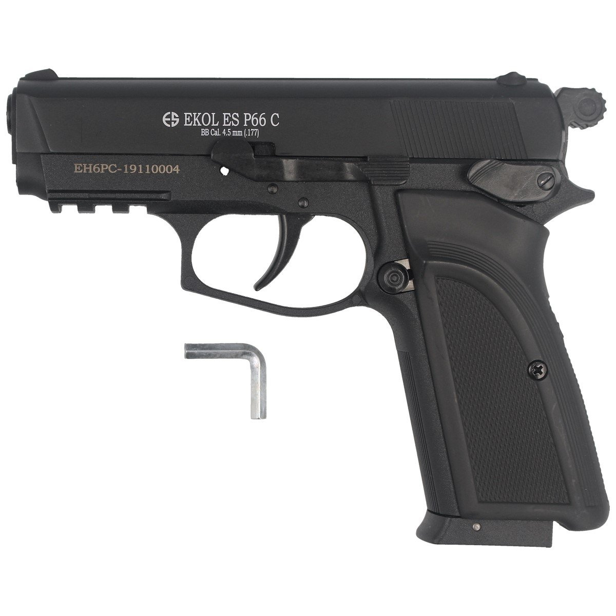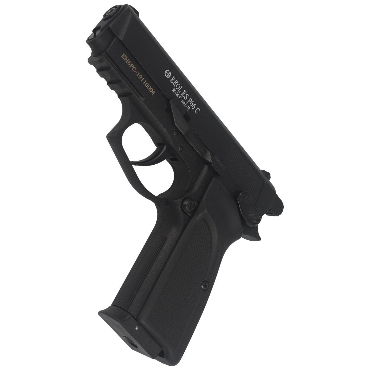 • Ekol ES P66C Black compact and ultra-lightweight semi-automatic air pistol, structurally based on a blank pistol. With such strong roots, this powerful airgun reaching a velocity of 135 m/s, is well-suited for dynamic sport shooting and tactical training.