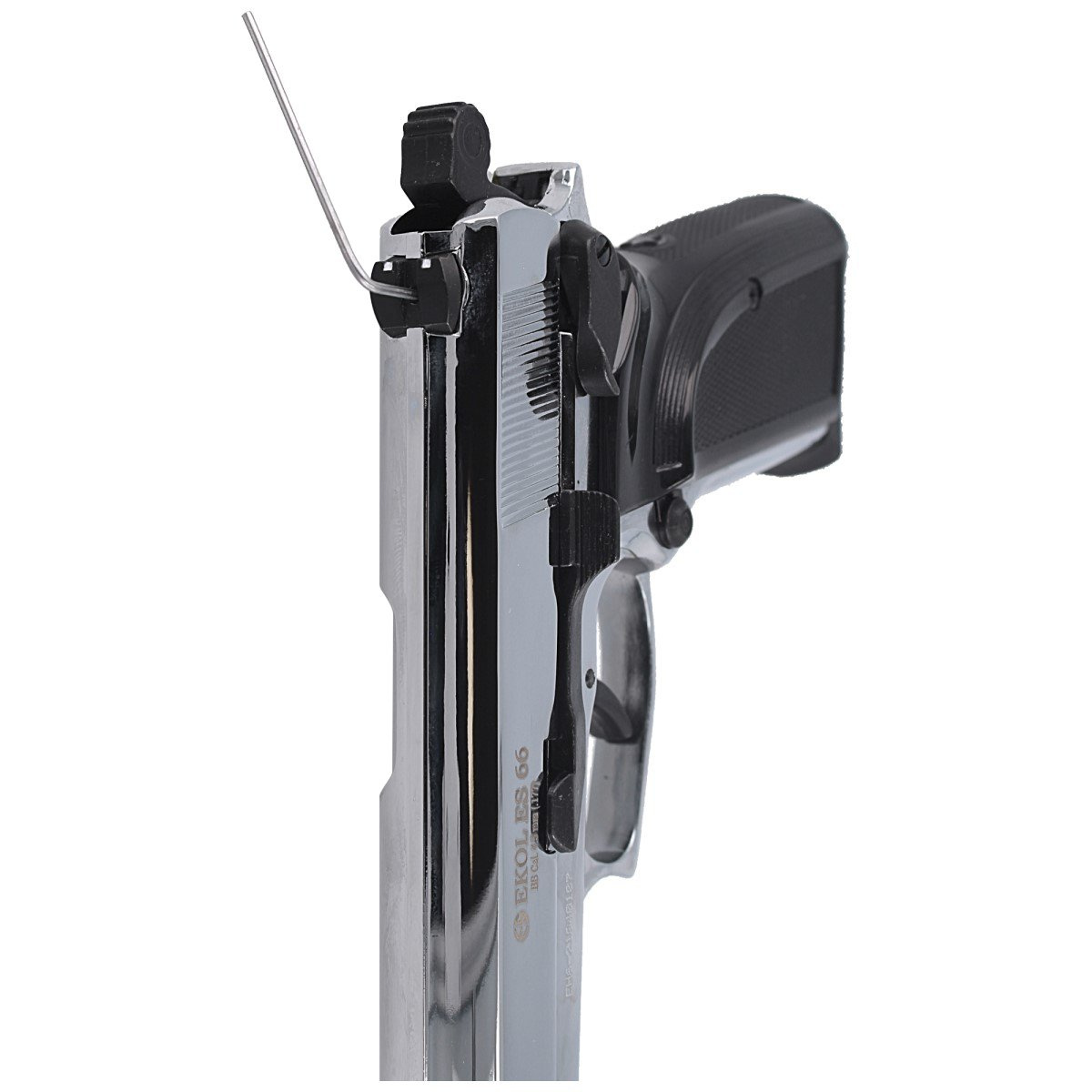Ekol ES 66 Shiny is an air pistol based on the blank-pistol design by Voltran. It offers a realistic appearance and a metal solid construction for durability and reliability. The slide, frame, hammer, decocker lever, and small components are all made of metal. With such strong roots, this is one of the most powerful air pistols, reaching a velocity of 150 m/s, making it suitable for dynamic sport shooting or tactical training.