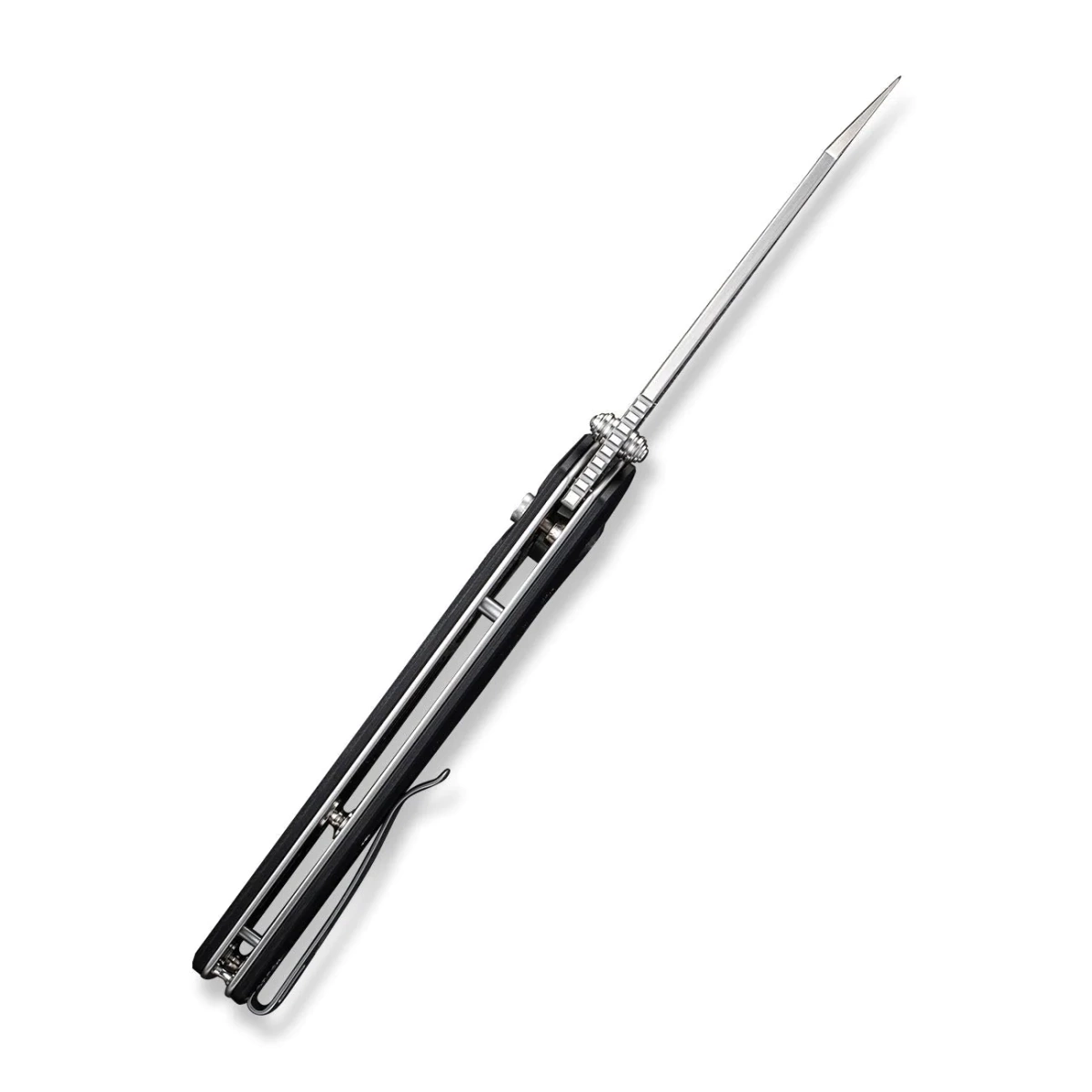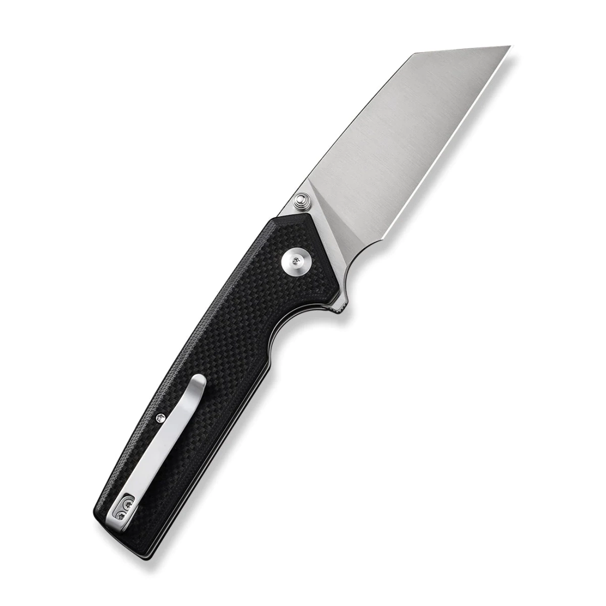 Handle - grips made of rough G10 (pressure-pressed fiberglass with synthetic resin) with a characteristic surface texture, which were screwed to steel liners. Chamfered edges on the covers eliminate sharp edges for a comfortable and secure grip. The so-called open-backed design attached with steel spacer sleeves reduces weight and facilitates cleaning. The pivot axis is decorated with a stylized Civivi brand logo. A two-position, right/left deep carry clip allows you to carry the knife discreetly in your pocket in tip-up position (blade tip up).