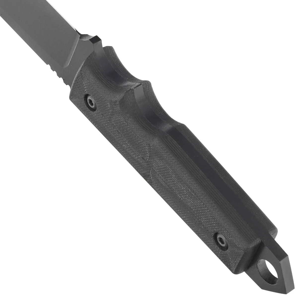 Handle - covered with durable G10 (fiberglass compressed with synthetic resin) grips in black, with a slightly rough surface. They provide excellent ergonomics and a secure grip. The profiled design of the Handle provides a comfortable grip on the knife in both directions, especially for users who appreciate an inverted grip. In the rear protruding part of the tango forms a massive glass striker, there is also a lanyard hole, a hole for a rope.
