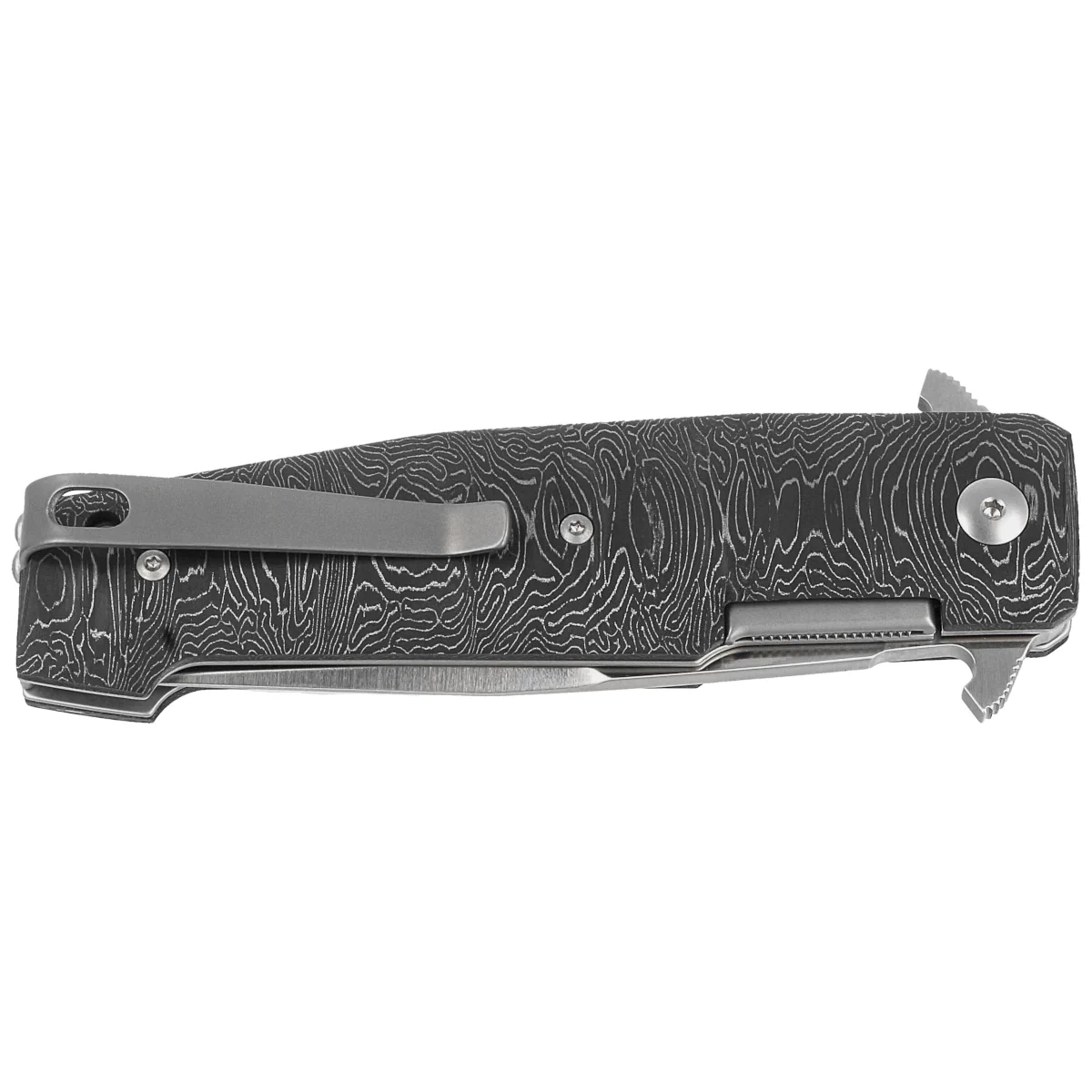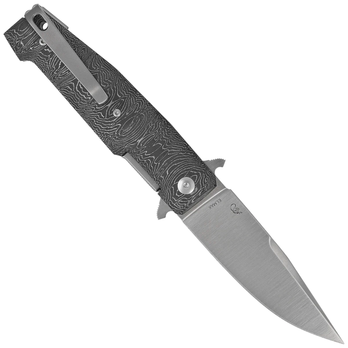 Handle - pieces of solid Damask Fatcarbon, a composite of carbon fiber of stainless steel fibers compressed under pressure with synthetic resin, insensitive to weather, resistant to chemicals and mechanical damage. The grips were screwed to a CNC-milled backspacer, which means that such a design is virtually indestructible. The chamfering of the cover eliminates sharp edges for comfort, and the fore finger groove made on the front improves grip security. A right-handed, single-position deep clip allows you to carry the knife discreetly in tip-up (tip up) position. At the end of the Handle lanyard hole, a hole for a cord.