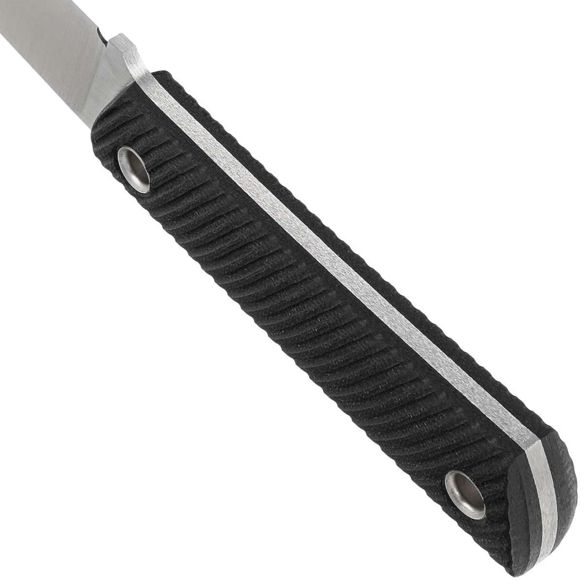 Handle - covered with durable G10 (fiberglass pressed with synthetic resin) grips in black, with a distinctive brindle texture. They provide excellent ergonomics and a secure grip. The symmetrical design of the Handle allows the knife to be held both ways, especially for users who appreciate an inverted grip.