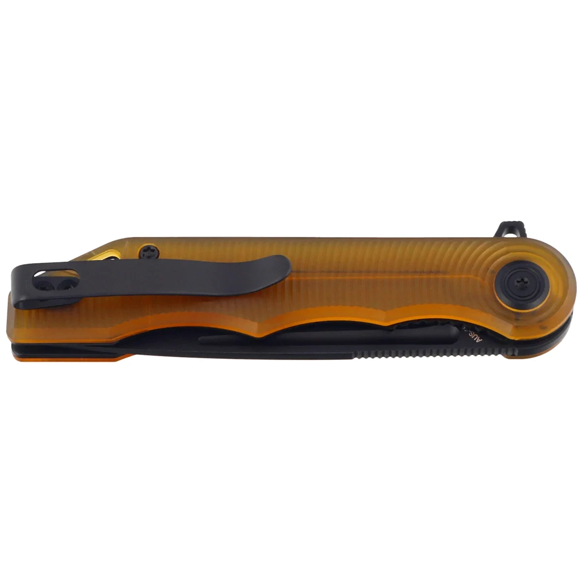 Handle - grips made of transparent Ultem™ plastic, textured to improve grip confidence, are bolted to the knife's steel frame. The so-called open-backed design without the typical backspacer, fastened together with steel spacer sleeves for easy cleaning. The simple, sturdy design gives assurance of many years of use. Ergonomic finger recesses for easy grip on the Handle. Pivot decorated with stylized manufacturer's logo. Two-position (right/left) steel deep carry clip allows you to carry the knife discreetly in your pocket in tip-up position (blade tip up). Above the clip a lanyard hole, a hole for threading a safety or decorative cord.