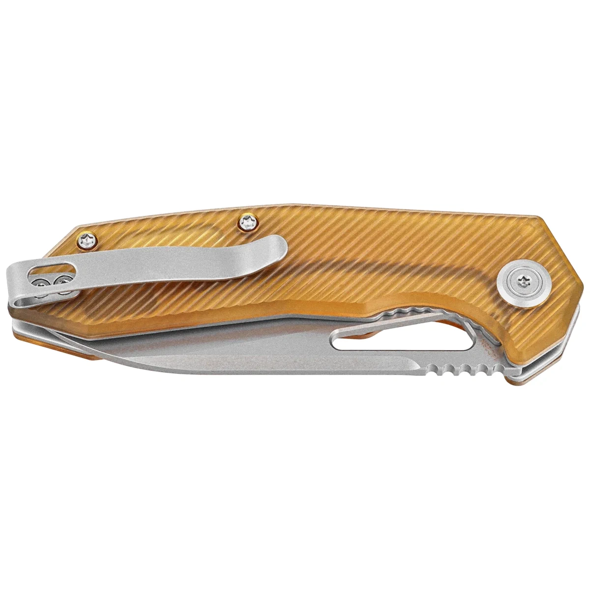 Handle - liners made of transparent Ultem™ plastic, textured for improved grip, bolted to the knife's steel frame. Chamfered edges of the sheaths eliminate sharp edges for comfort and improve grip confidence. The so-called open-backed design without the typical backspacer, fastened together with steel spacer sleeves for easy cleaning. The simple, secure design provides confidence for years of use. A deep finger undercut (fore finger groove) improves grip security. The pivot axis is decorated with a stylized Kubey Knife brand logo. A two-position (right.left) titanium deep carry clip allows you to carry the knife discreetly in your pocket in tip-up (blade tip up) position.