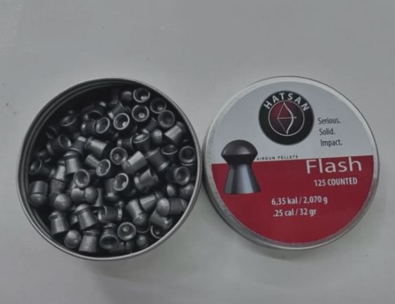 - Hatsan Flash .25 – premium .25 caliber pellets (6.35mm) designed for long-range shooting with exceptional aerodynamics (flat, stable trajectory) and retention. The rounded profile ensures accuracy, high impact force, and penetration. 125 pieces.