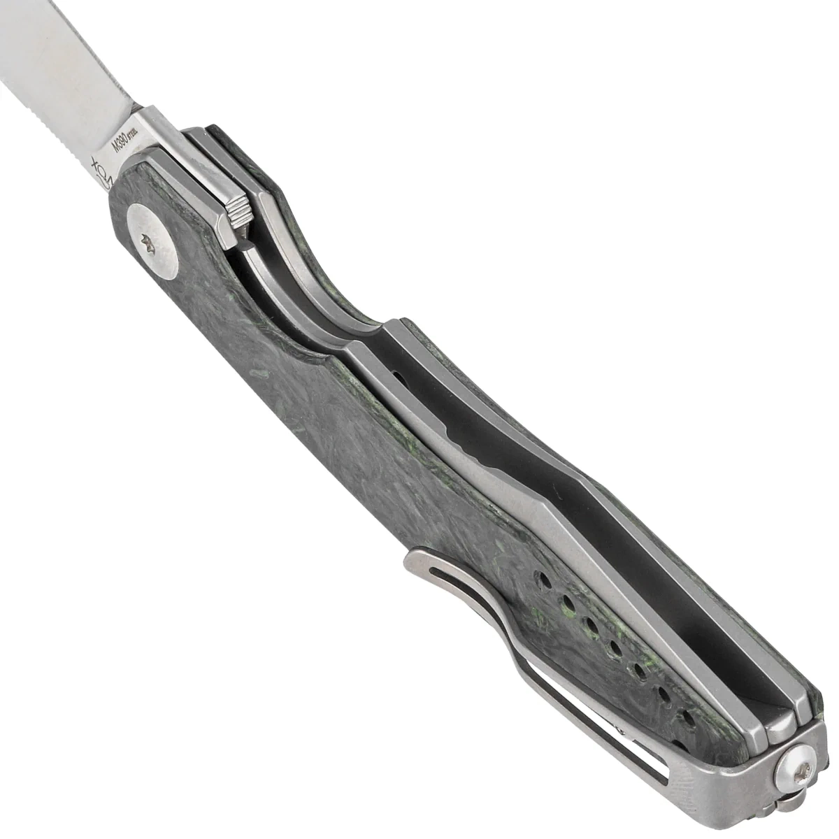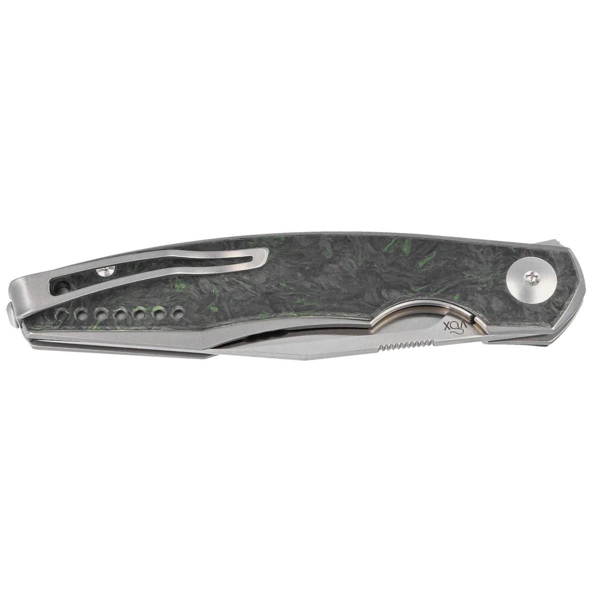 Handle - made of solid titanium 6AL4V finished stonewashed method. Contouring of the covers eliminates sharp edges. On both sides there is an overlay (overlay) made of Dark Green Matter Carbon Fiber. The grips are joined together using a titanium backspacer. The single-position clip (right), made of titanium, allows the knife to be carried in tip-up position. Under the clip a lanyard hole, a hole for attaching a safety or decorative cord.