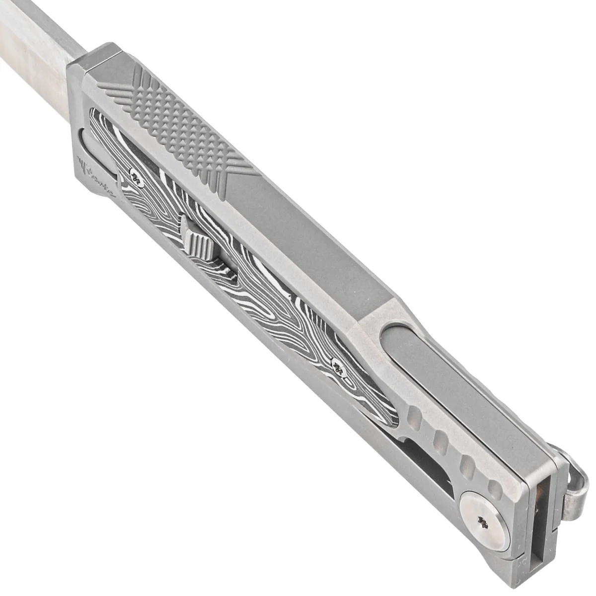 Handle – CNC-machined, titanium Exoskeleton construction. The external frame features a movable upper section responsible for opening and closing the knife. The chamfered edges of the sheaths eliminate sharp edges, and the perfectly matched G10 composite inlays in the unique Damascus pattern add an exclusive touch and improve grip security. On the right side, there is a finely crafted sliding lock slider for blade deployment and retraction. When shifted into the safe “lock” position, the knife cannot open or close accidentally. A single-position titanium deep-carry clip (right side) allows discreet pocket carry in a tip-down orientation (blade tip pointing down).