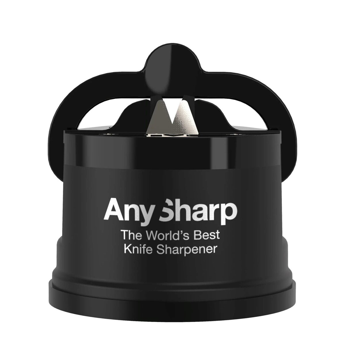 - AnySharp Classic Black, an extremely efficient knife sharpener. Thanks to its compact size, it is easy to store. The triangular sharpening plates, made of tungsten carbide alloy will easily sharpen any knife, including serrated ones!