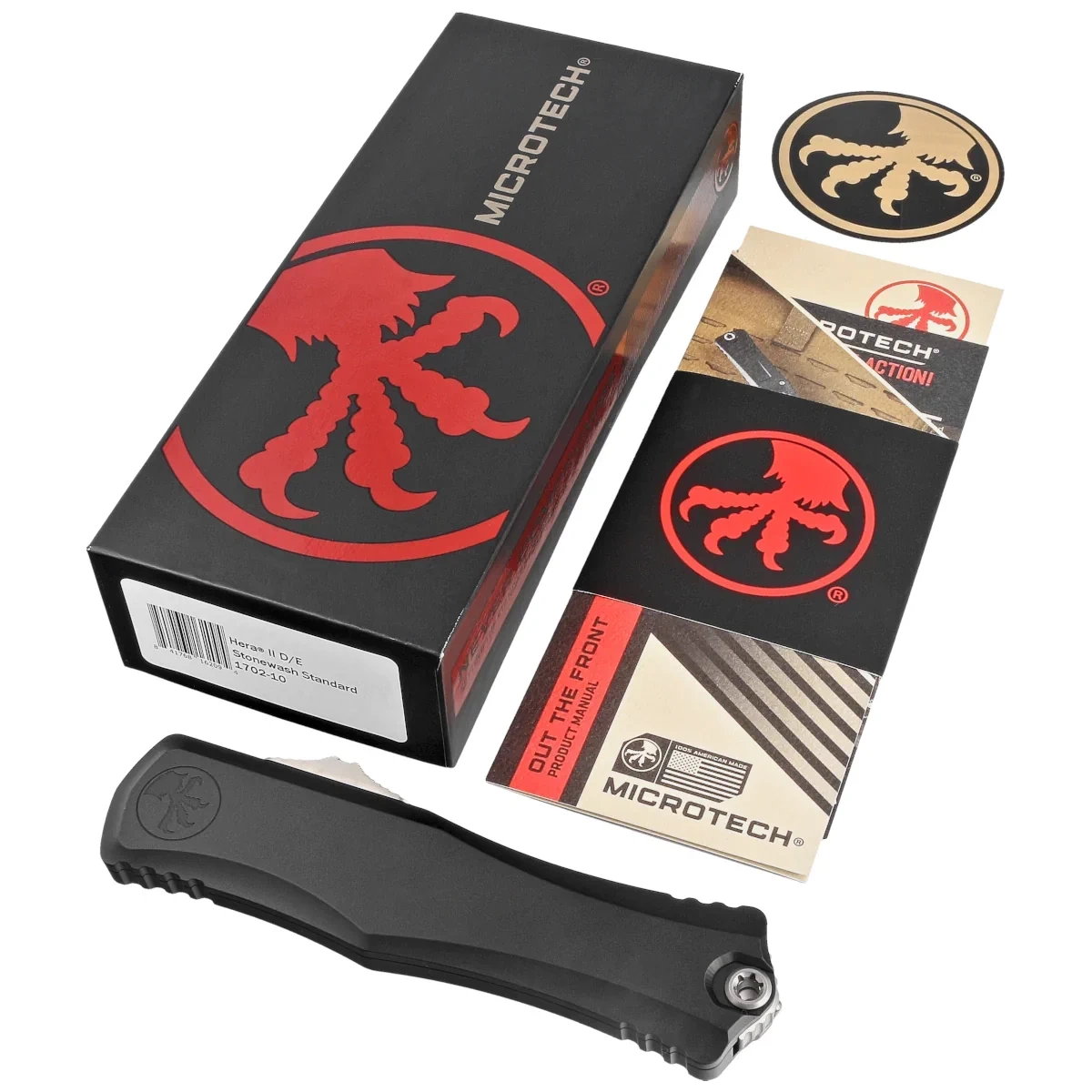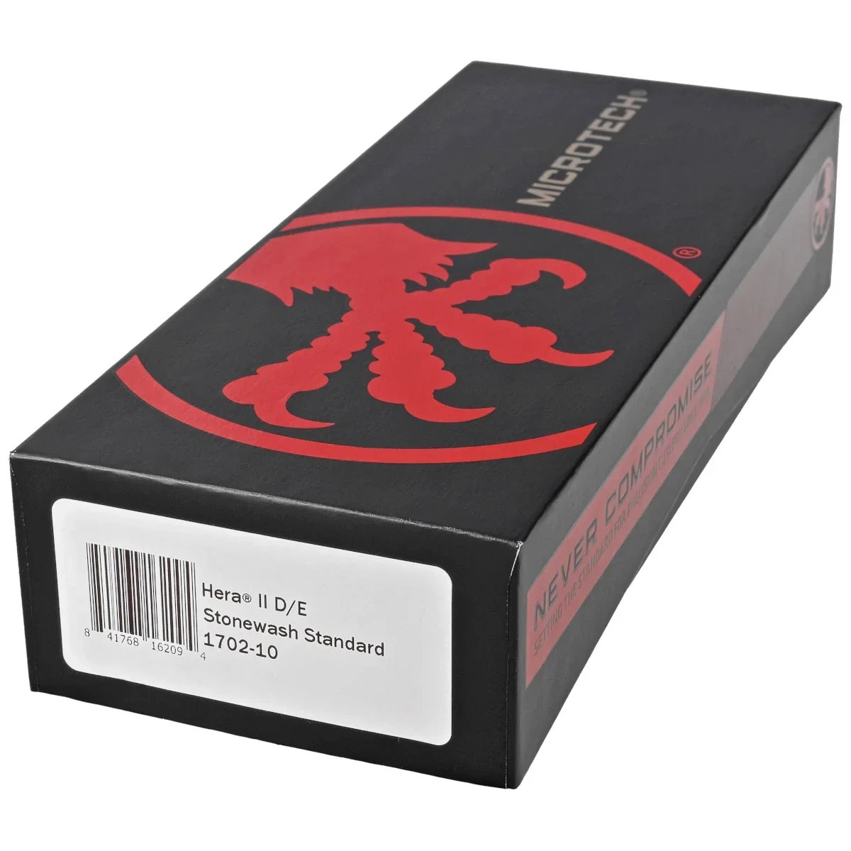 Hera II D/E Black Aluminum, Stonewashed one of the most versatile OTF (Out The Front) automatic knives. Inspired by the iconic Troodon, it bridges the gap between EDC models and fully tactical designs. The exceptionally durable D/A (Double Action) mechanism provides fast, powerful, and reliable blade deployment and retraction. The knife stands out with its excellent fit, finish, and overall build quality. A design by Anthony Marfione, renowned knifemaker and owner of Microtech Knives.